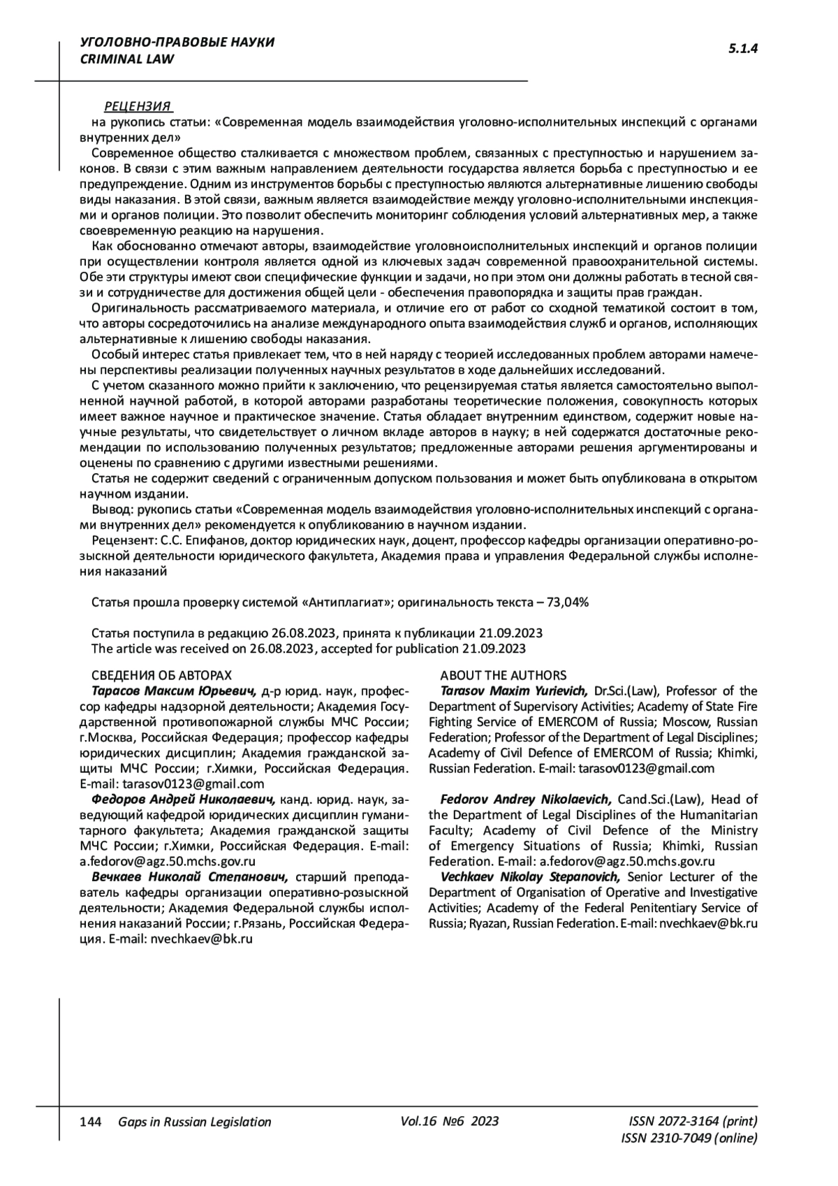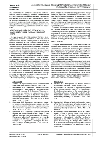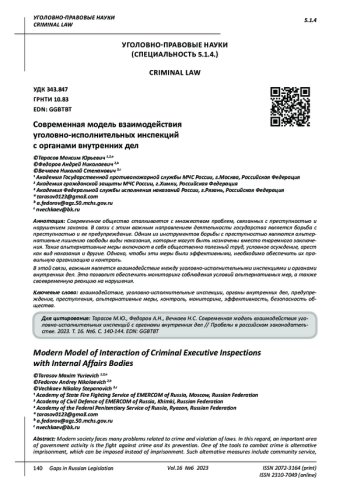 Статья: СОВРЕМЕННАЯ МОДЕЛЬ ВЗАИМОДЕЙСТВИЯ УГОЛОВНО-ИСПОЛНИТЕЛЬНЫХ ИНСПЕКЦИЙ С ОРГАНАМИ ВНУТРЕННИХ ДЕЛ (2023)