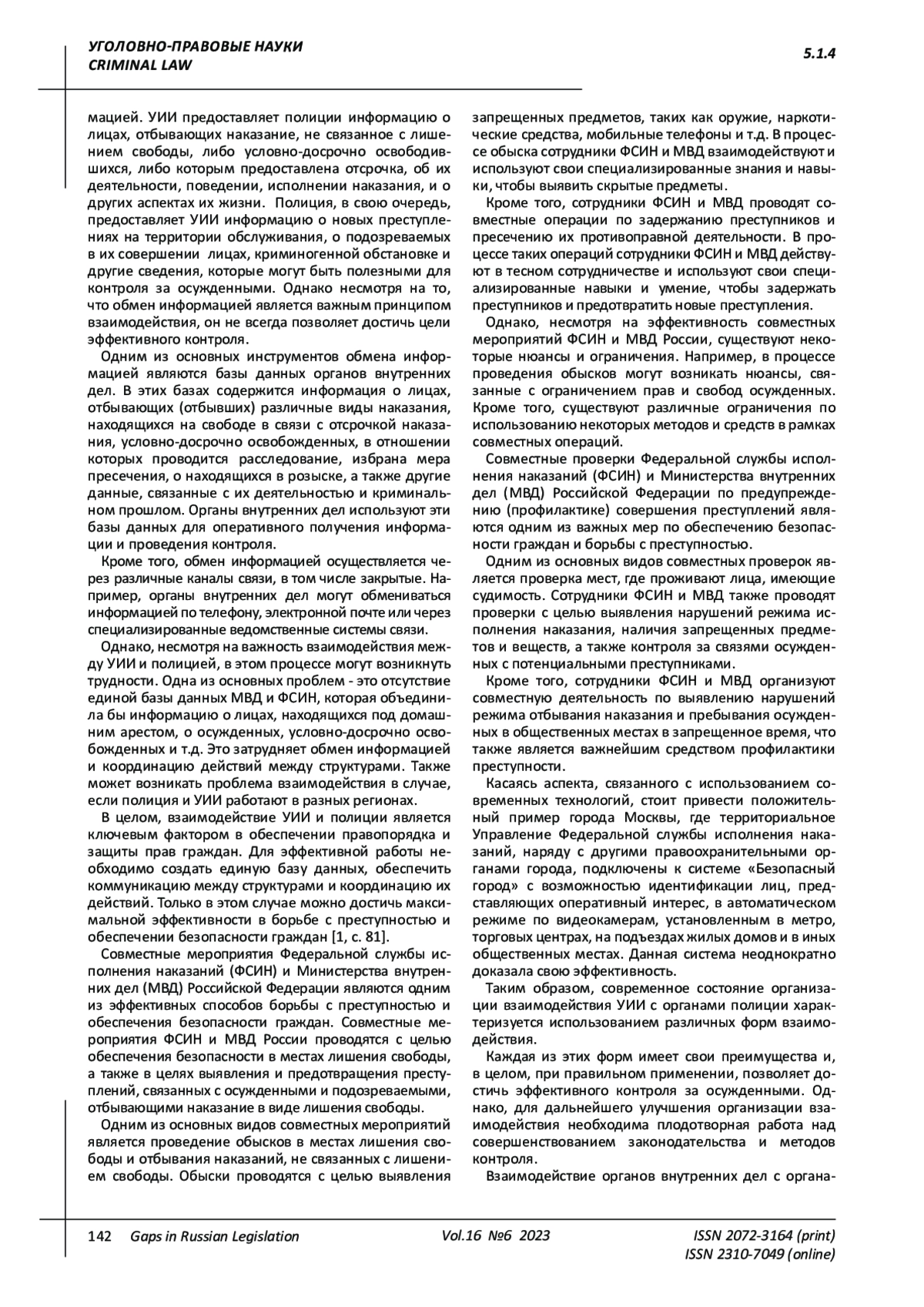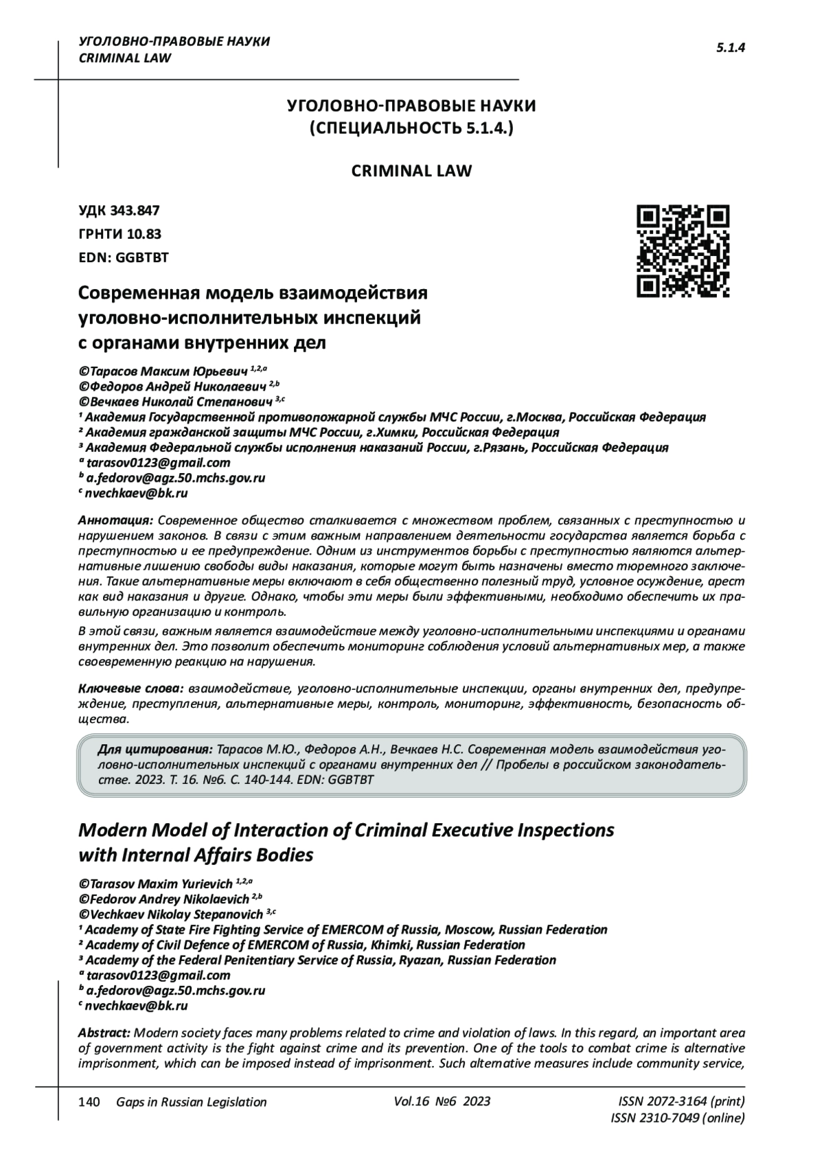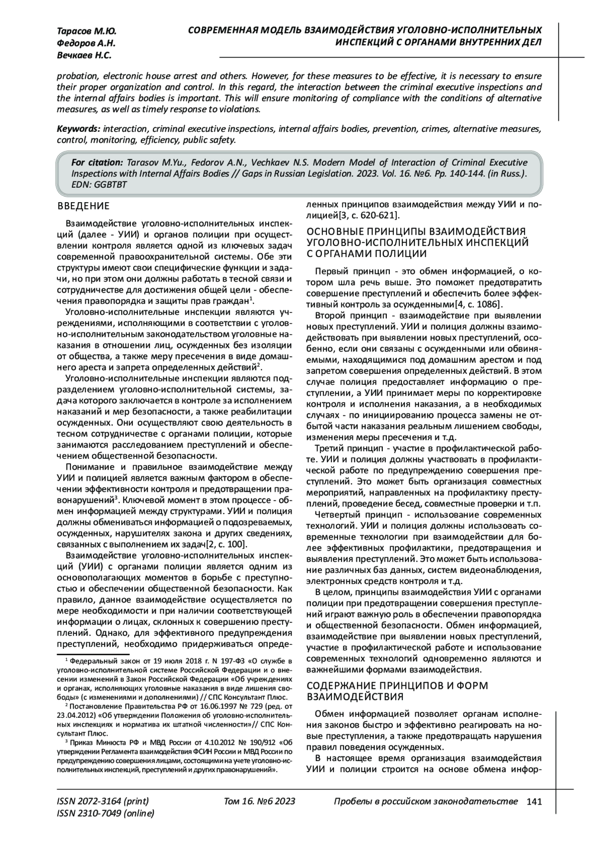 ВЕЧКАЕВ Н. С., ФЕДОРОВ А. Н., ТАРАСОВ М. Ю. СОВРЕМЕННАЯ МОДЕЛЬ ВЗАИМОДЕЙСТВИЯ УГОЛОВНО-ИСПОЛНИТЕЛЬНЫХ ИНСПЕКЦИЙ С ОРГАНАМИ ВНУТРЕННИХ ДЕЛ // ПРОБЕЛЫ В РОССИЙСКОМ ЗАКОНОДАТЕЛЬСТВЕ. 2023. Т. 16 № 6