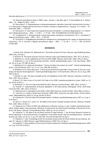 19. Развитие российского права в 1940-е годы : моногр. / под общ. ред. С. А. Боголюбова, Д. А. Пашенцева. - М. : Инфра-М, 2025. - 321 с.