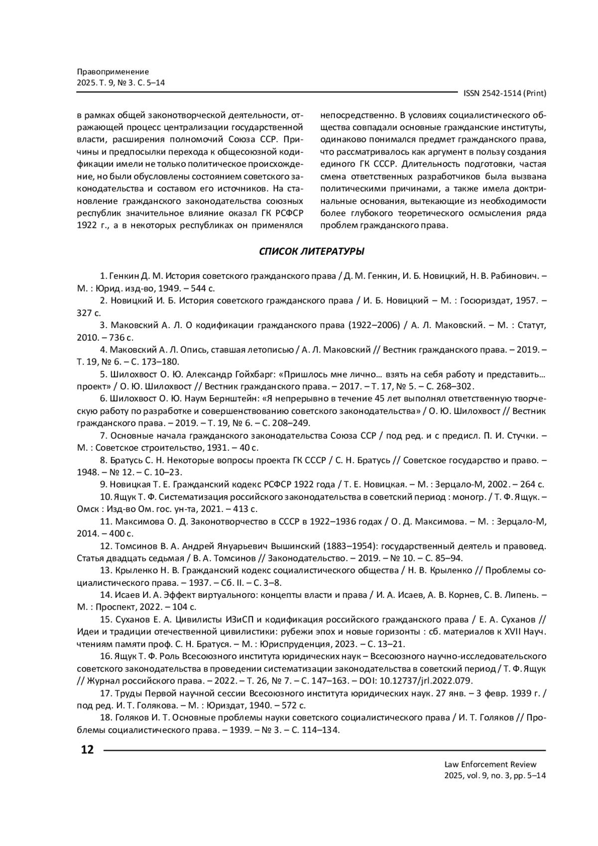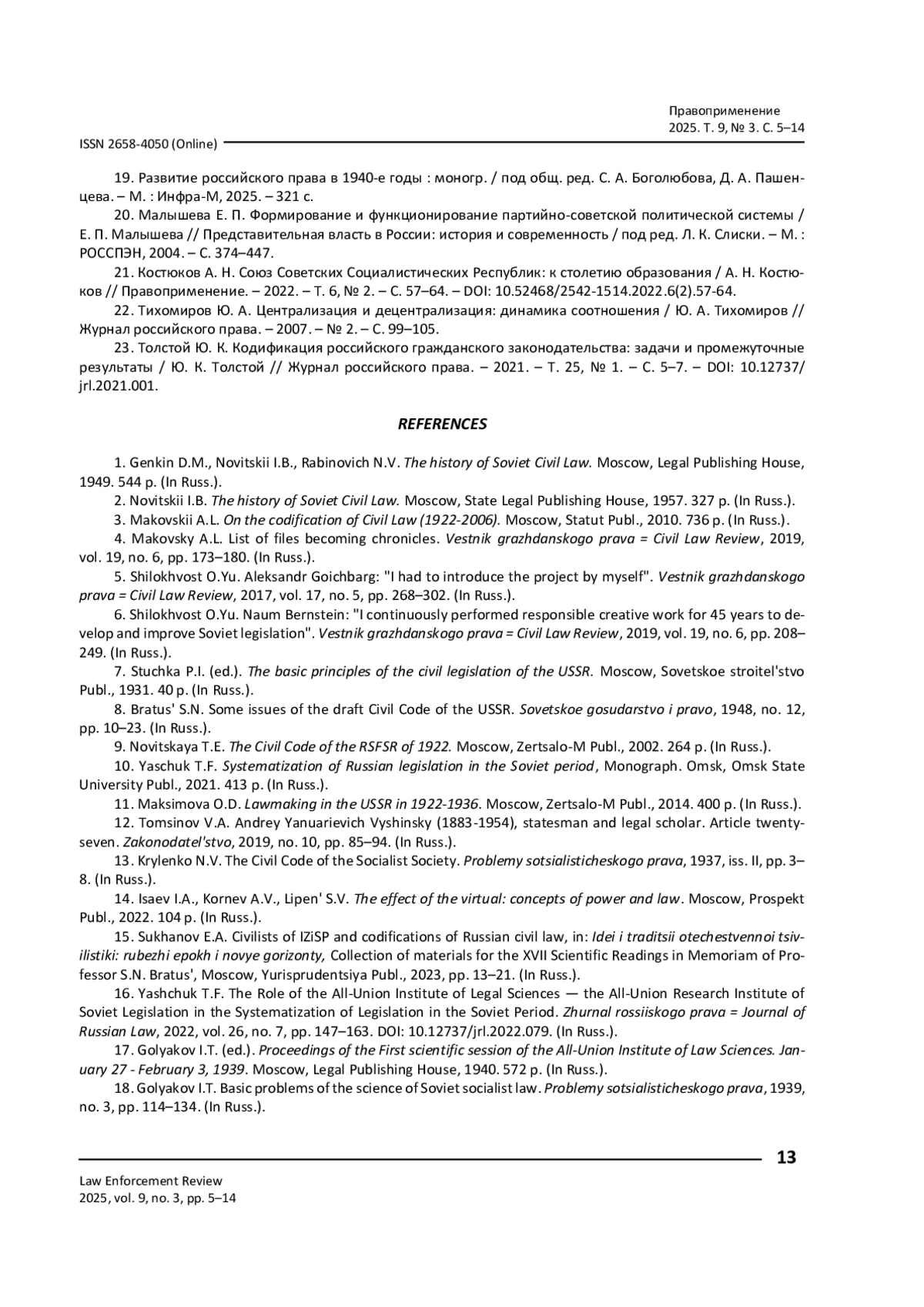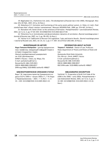 16. Ящук Т. Ф. Роль Всесоюзного института юридических наук - Всесоюзного научно-исследовательского советского законодательства в проведении систематизации законодательства в советский период / Т. Ф. Ящук // Журнал российского права. - 2022. - Т. 26, № 7. - С. 147-163. - https://doi.org/10.12737/jrl.2022.079.