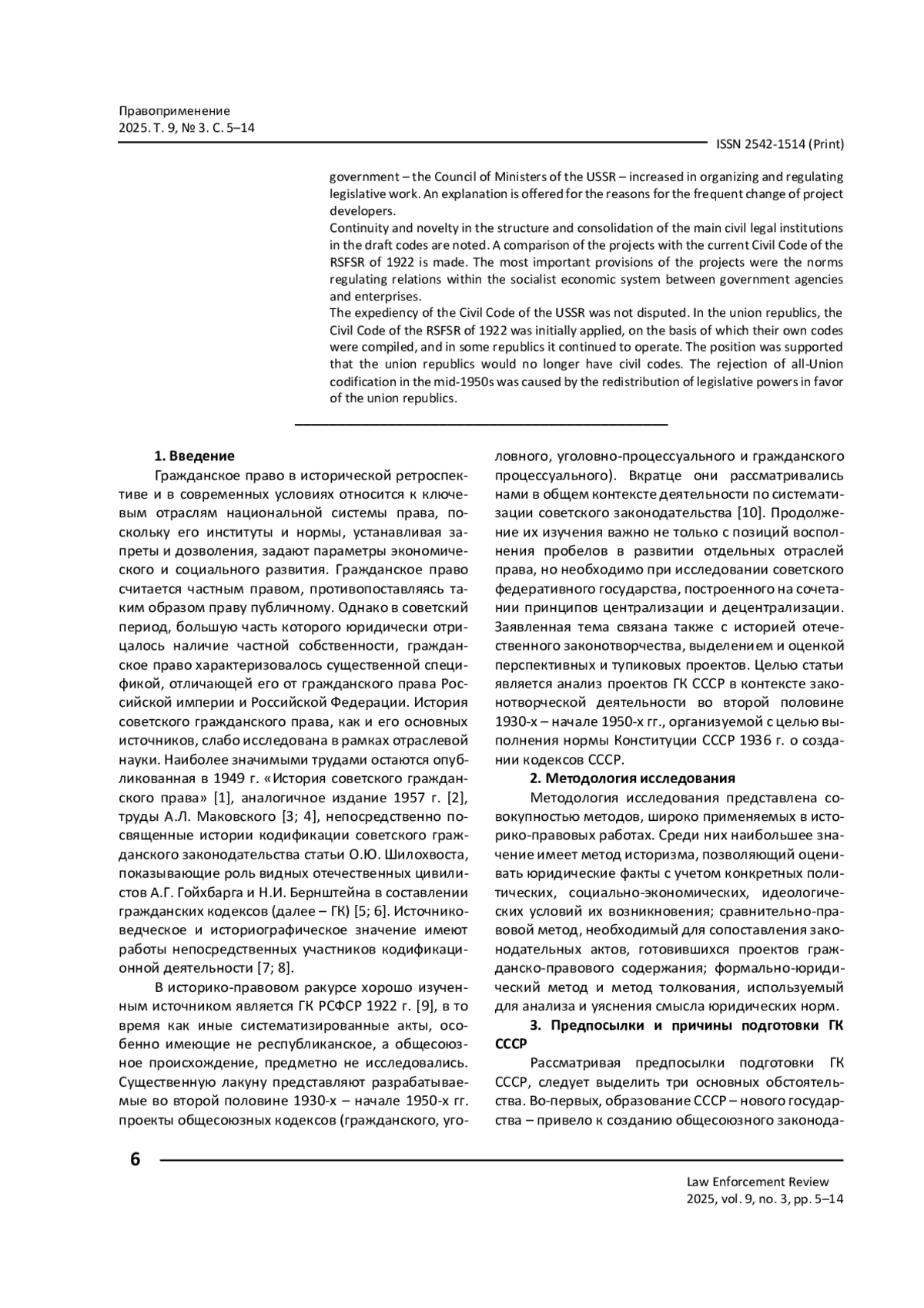 Рассмотрены проекты гражданских кодексов СССР. Установлены следующие причины перехода к общесоюзной кодификации в 1930-е гг.: возрастание массива законодательства СССР, что требовало его систематизации; подтвержденная практикой эффективность кодекса как вида нормативного правового акта; расширение законодательных полномочий общесоюзных органов согласно Конституции СССР 1936 г. Выявлены и проанализированы основные проекты Гражданского кодекса СССР, которые составлялись в довоенный и послевоенный периоды. Определены институциональные структуры, занимавшиеся их составлением, показана их неоднократная смена. Отмечена преемственность и новизна в структуре и закреплении основных гражданских правовых институтов в проектах кодексов. Предложено объяснение прекращения кодификационной деятельности.