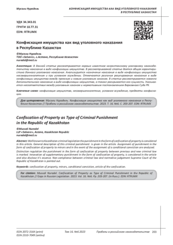Статья: КОНФИСКАЦИЯ ИМУЩЕСТВА КАК ВИД УГОЛОВНОГО НАКАЗАНИЯ В РЕСПУБЛИКЕ КАЗАХСТАН (2023)