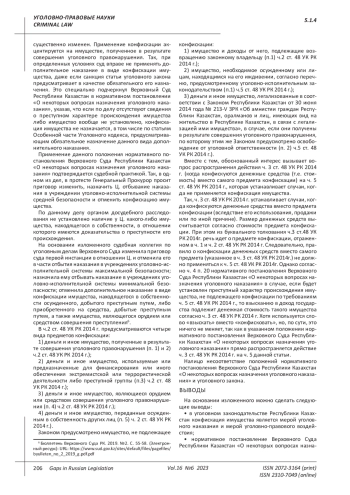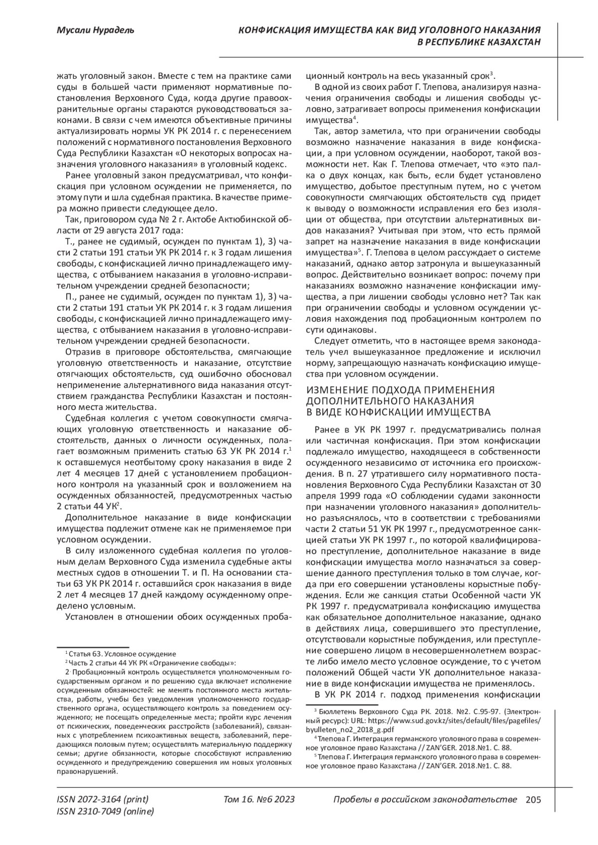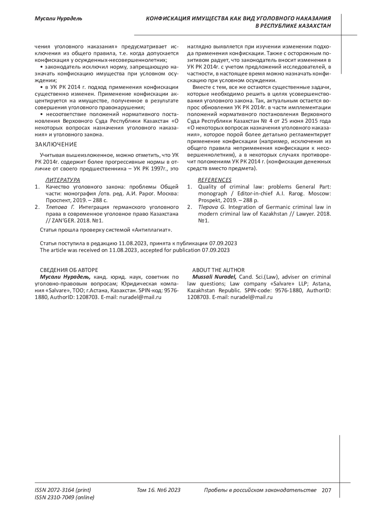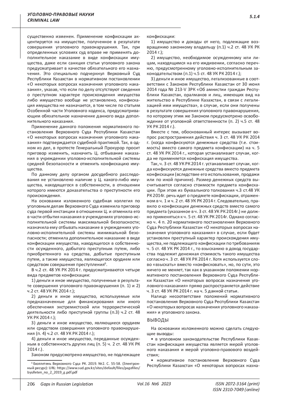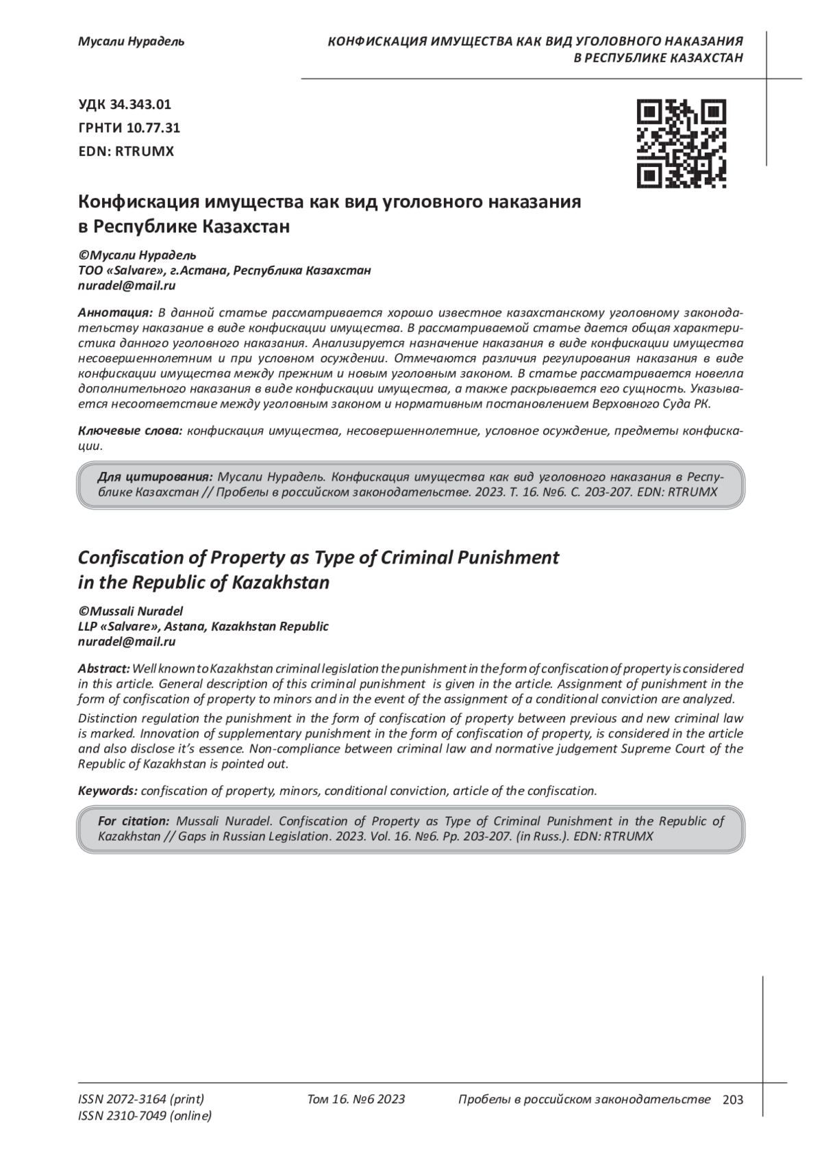 МУСАЛИ Н. КОНФИСКАЦИЯ ИМУЩЕСТВА КАК ВИД УГОЛОВНОГО НАКАЗАНИЯ В РЕСПУБЛИКЕ КАЗАХСТАН // ПРОБЕЛЫ В РОССИЙСКОМ ЗАКОНОДАТЕЛЬСТВЕ. 2023. Т. 16 № 6
