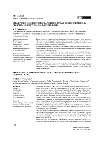 Юридическая институционализация судимости как основания ограничения пассивных избирательных прав предполагает поиск баланса между необходимостью обеспечить адекватное народное волеизъявление при формировании публичной власти и задачей предотвращения криминализации власти. В статье рассматриваются три способа юридической институционализации судимости как основания ограничения пассивных избирательных прав: категориальный, видовой и казуальный (индивидуальный). Автор приходит к выводу о том, что как категориальный, так и видовой подходы к определению составов преступлений, совершение которых является основанием для ограничения пассивных избирательных прав, объективно недостаточны и должны быть дополнены казуальным способом, который предполагает выделение конкретных статей Уголовного кодекса РФ, закрепляющих ответственность за конкретные противоправные деяния. В работе выделены четыре конституционно легитимные цели ограничения пассивных избирательных прав в связи с наличием судимости и предпринята попытка (иллюстративная) выделения конкретных составов преступления, которые должны влечь указанное ограничение.