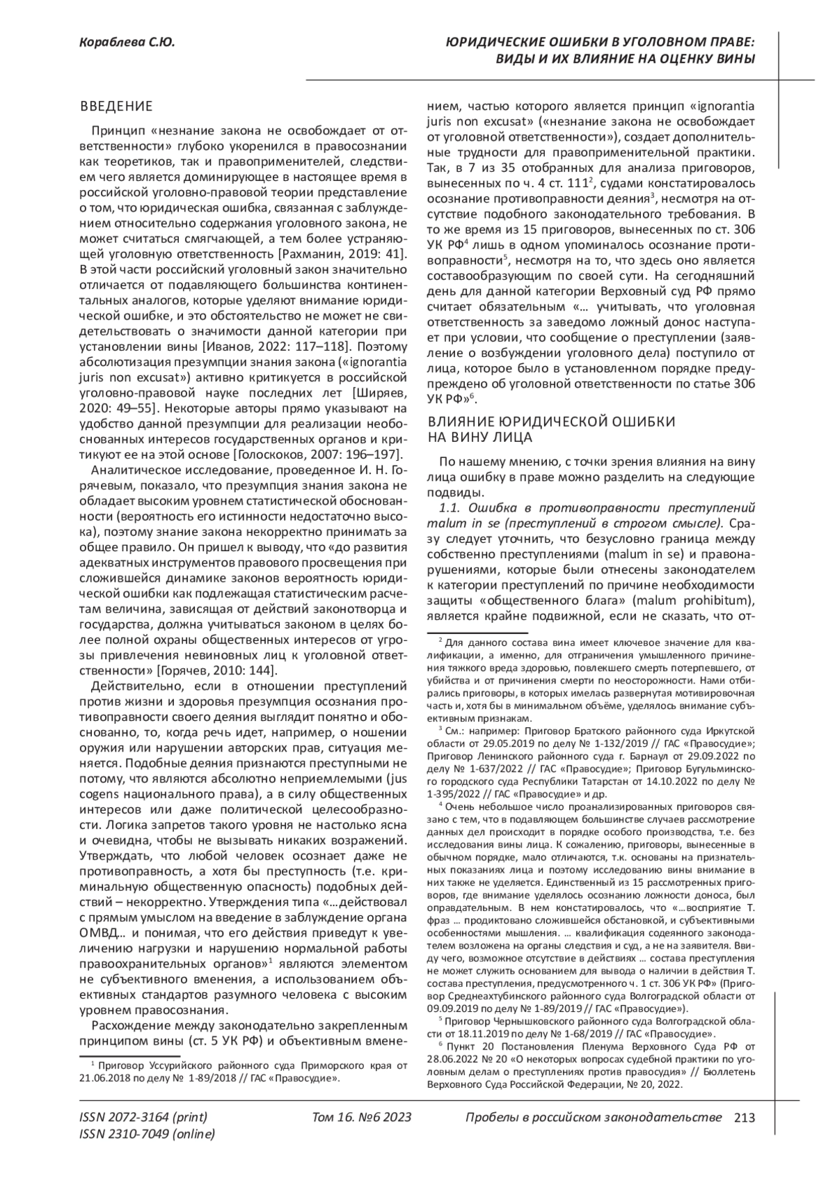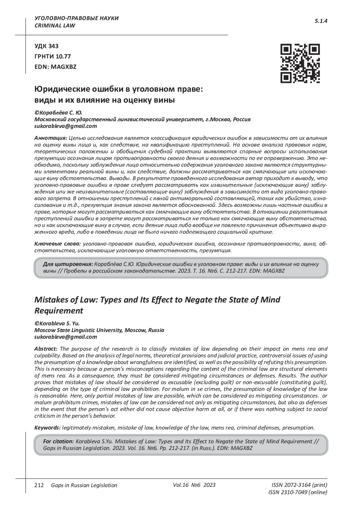 11. Ширяев А. Ю. Проблема оценки умышленной вины в свете учения о юридической ошибке // Российское право: образование, практика, наука. 2020. № 6. С. 49-55. EDN: AVCKYY