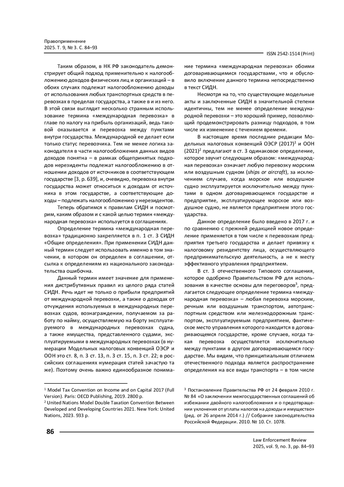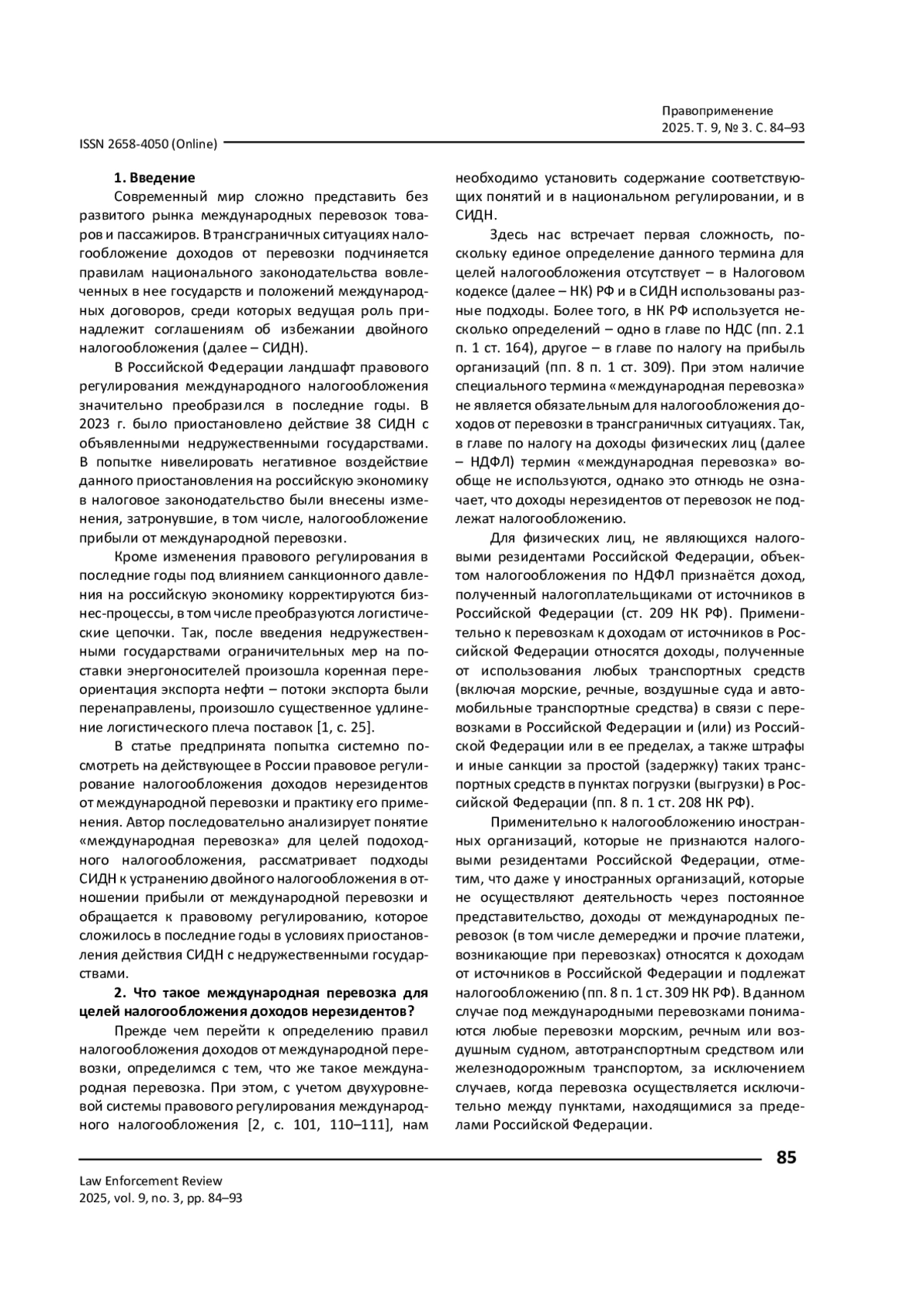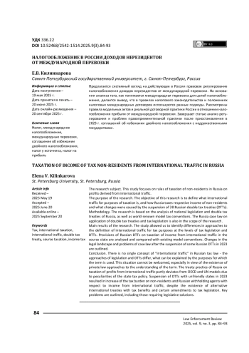 Предлагается системный взгляд на действующее в России правовое регулирование налогообложения доходов нерезидентов от международной перевозки. На основании анализа того, как понимается международная перевозка для целей налогообложения, делается вывод, что в правилах налогового законодательства и положениях налоговых международных договоров используются разные подходы. Рассмотрены правила модельных актов и реальной договорной практики России в отношении налогообложения прибыли от международной перевозки. Завершает статью анализ регулирования и проблем правоприменительной практики после приостановления в 2023 г. соглашений об избежании двойного налогообложения с недружественными государствами.