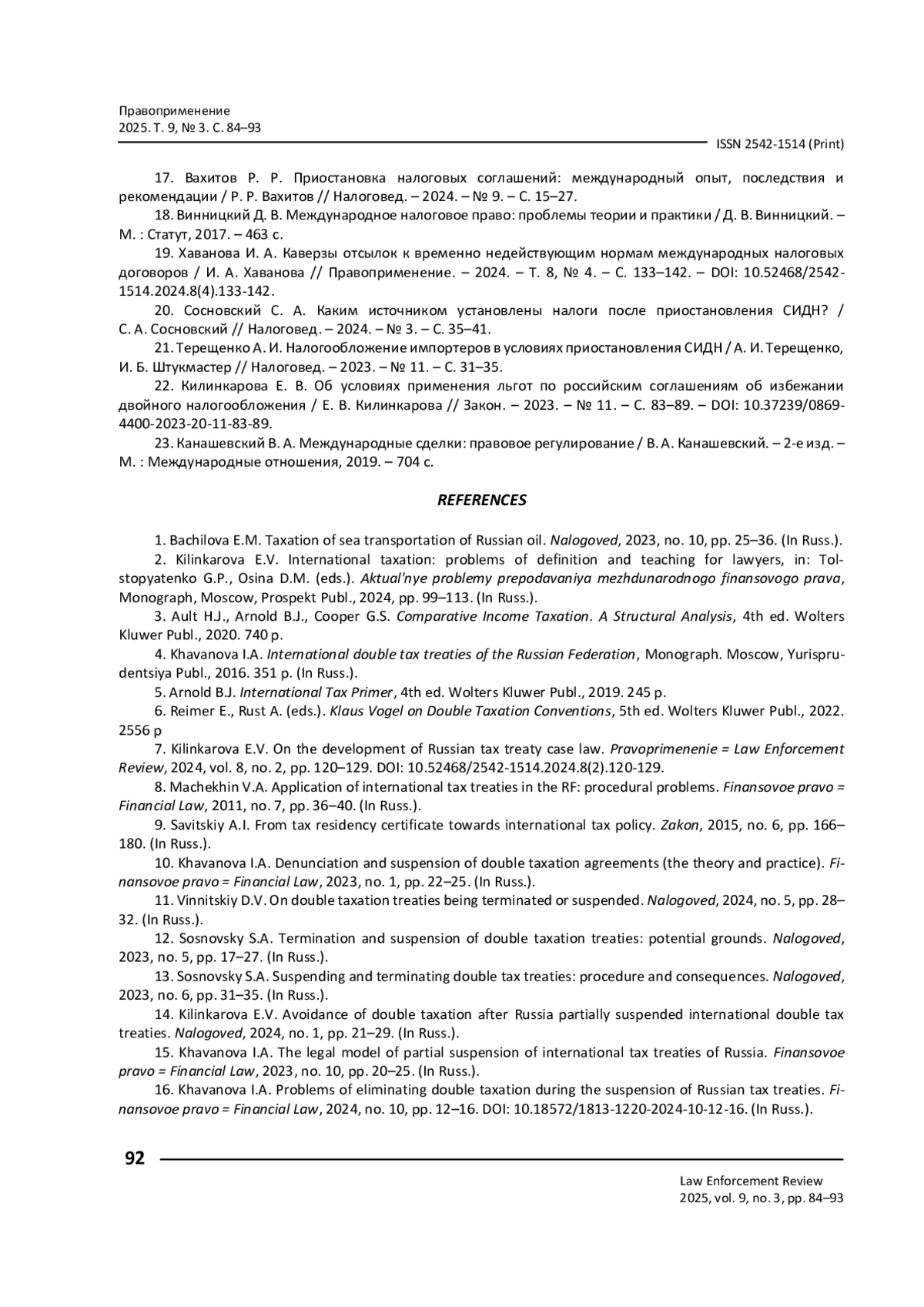 17. Вахитов Р. Р. Приостановка налоговых соглашений: международный опыт, последствия и рекомендации / Р. Р. Вахитов // Налоговед. - 2024. - № 9. - С. 15-27.
