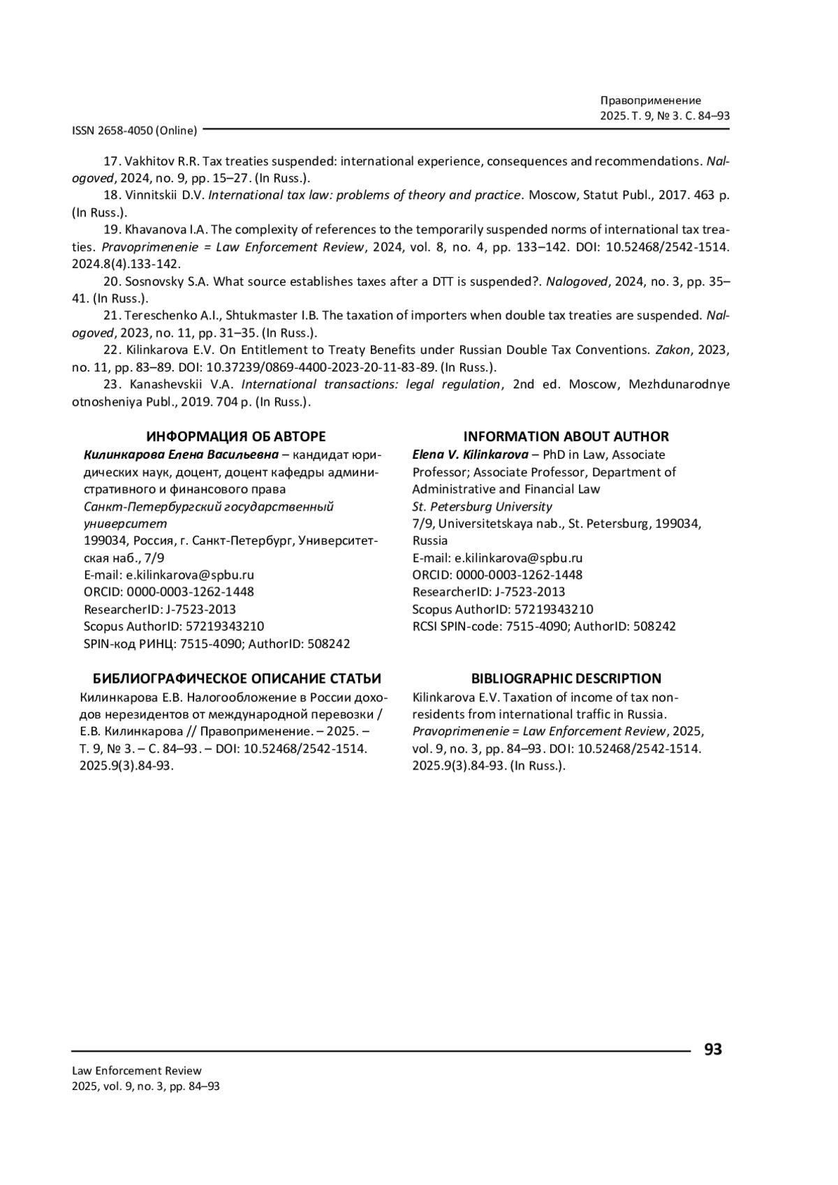 22. Килинкарова Е. В. Об условиях применения льгот по российским соглашениям об избежании двойного налогообложения / Е. В. Килинкарова // Закон. - 2023. - № 11. - С. 83-89. - https://doi.org/10.37239/0869-4400-2023-20-11-83-89.