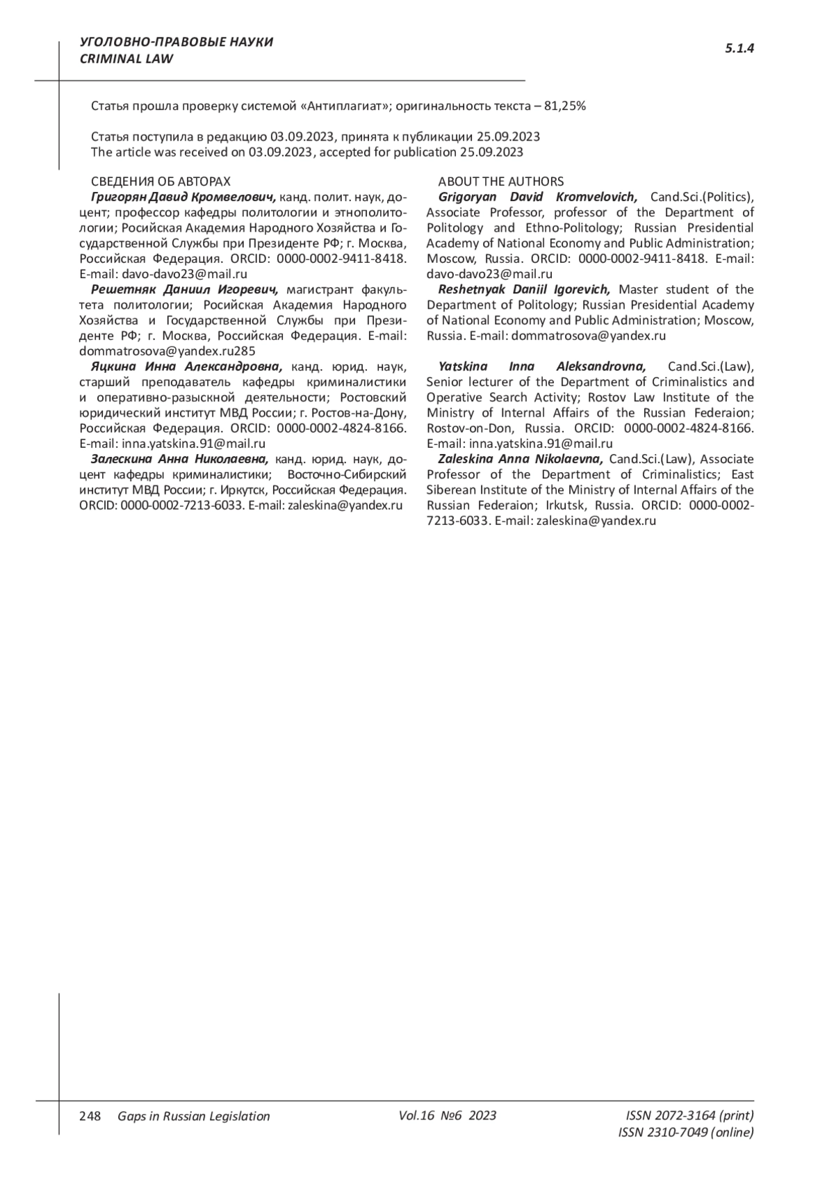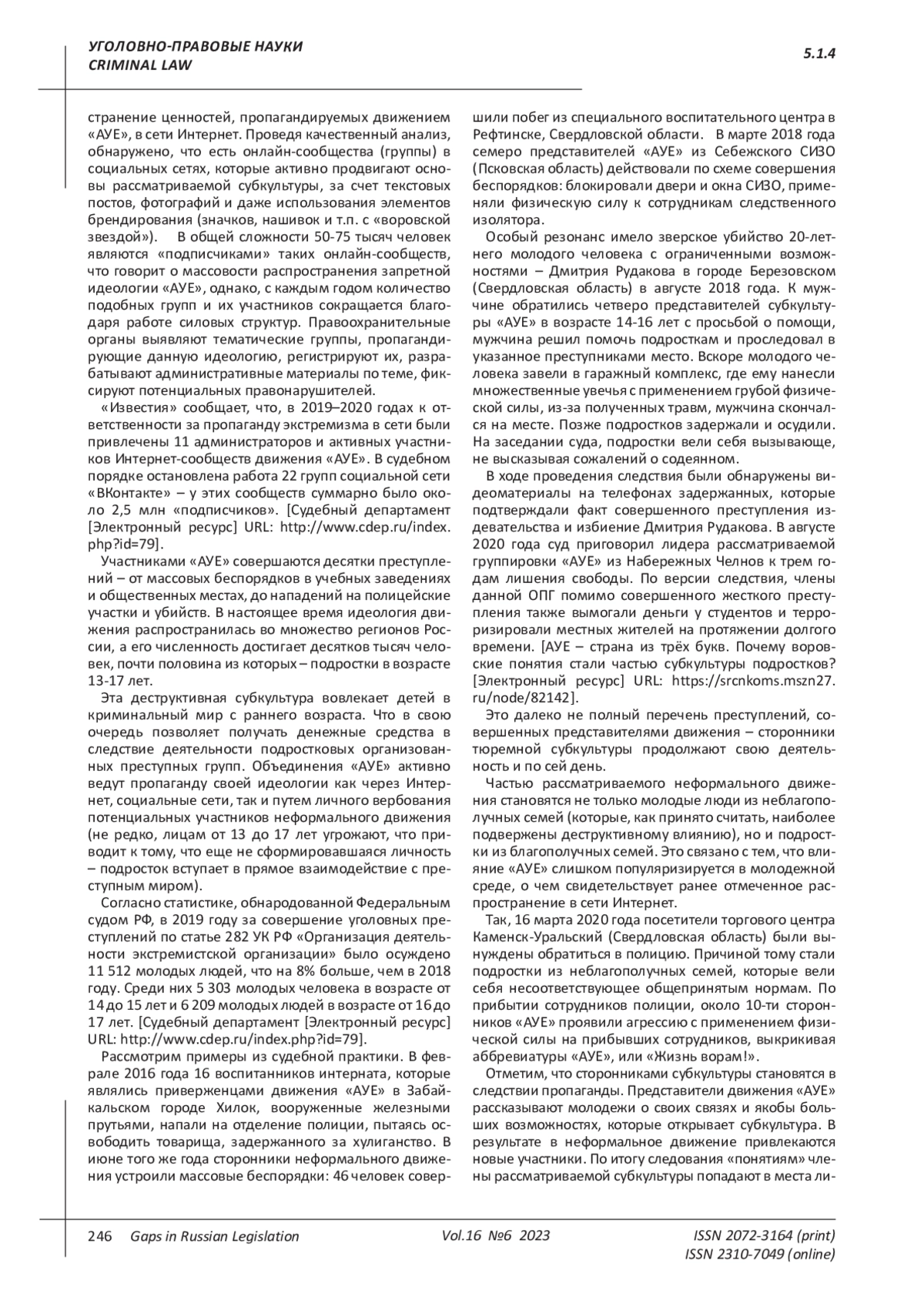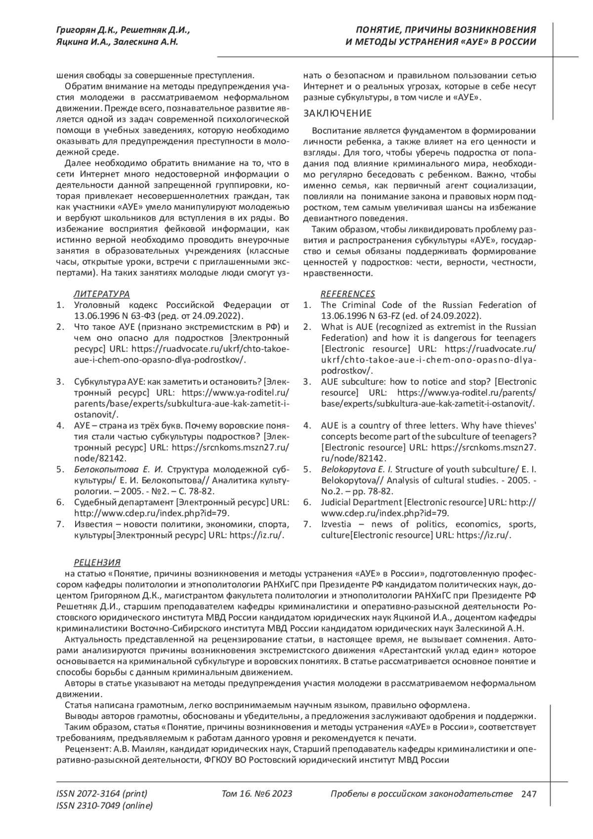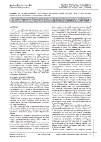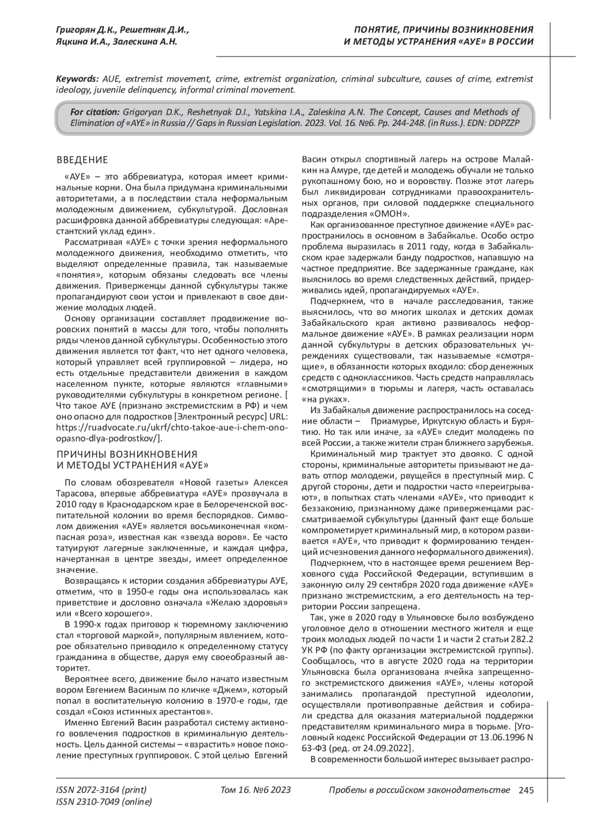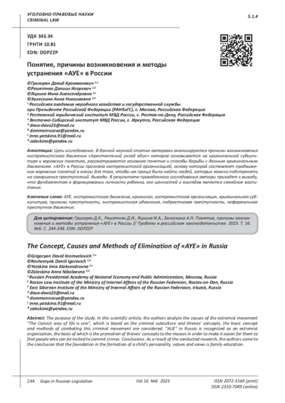 РЕШЕТНЯК Д. И., ЯЦКИНА И. А., ЗАЛЕСКИНА А. Н., ГРИГОРЯН Д. К. ПОНЯТИЕ, ПРИЧИНЫ ВОЗНИКНОВЕНИЯ И МЕТОДЫ УСТРАНЕНИЯ "АУЕ" В РОССИИ // ПРОБЕЛЫ В РОССИЙСКОМ ЗАКОНОДАТЕЛЬСТВЕ. 2023. Т. 16 № 6