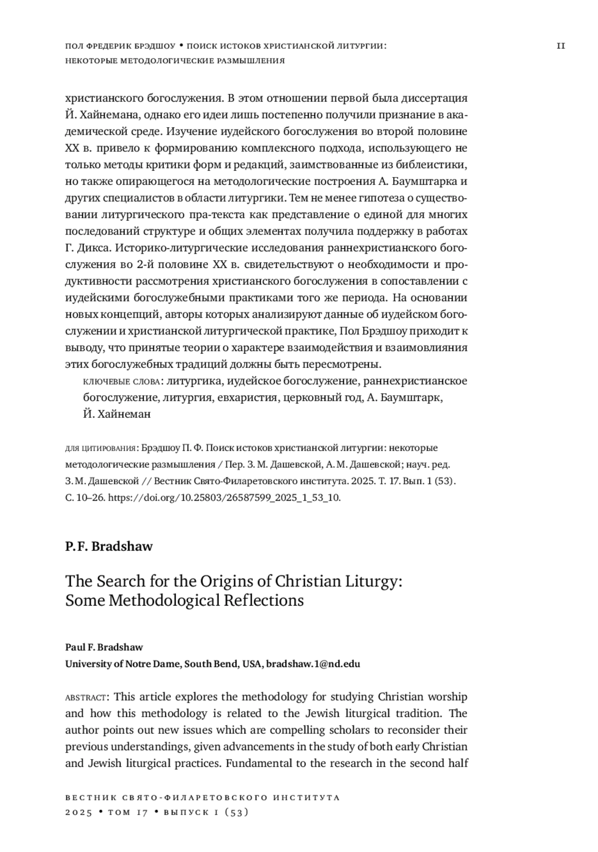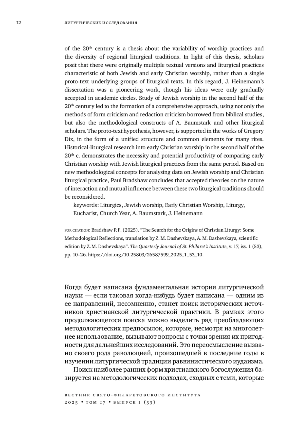 В статье рассматривается методология изучения христианского богослужения в связи с иудейской богослужебной традицией. Автор указывает на новые вызовы, которые побуждают ученых переосмысливать концепции предыдущей эпохи в связи с достижениями в области исследований как раннехристианской, так и иудейской богослужебной практики. Основополагающим в исследованиях 2-й половины XX в. является тезис о вариативности богослужебных практик и разнообразии региональных литургических традиций, поэтому на смену гипотезе о существовании единого пра-текста, лежащего в основании групп литургических текстов, были выдвинуты предположения об изначальной множественности текстуальных версий и литургических практик, характерных как для иудейского, так и для раннехристианского богослужения. В этом отношении первой была диссертация Й. Хайнемана, однако его идеи лишь постепенно получили признание в академической среде. Изучение иудейского богослужения во второй половине XX в. привело к формированию комплексного подхода, использующего не только методы критики форм и редакций, заимствованные из библеистики, но также опирающегося на методологические построения А. Баумштарка и других специалистов в области литургики. Тем не менее гипотеза о существовании литургического пра-текста как представление о единой для многих последований структуре и общих элементах получила поддержку в работах Г. Дикса. Историко-литургические исследования раннехристианского богослужения во 2-й половине ХХ в. свидетельствуют о необходимости и продуктивности рассмотрения христианского богослужения в сопоставлении с иудейскими богослужебными практиками того же периода. На основании новых концепций, авторы которых анализируют данные об иудей ском богослужении и христианской литургической практике, Пол Брэдшоу приходит к выводу, что принятые теории о характере взаимодействия и взаимо влияния этих богослужебных традиций должны быть пересмотрены.