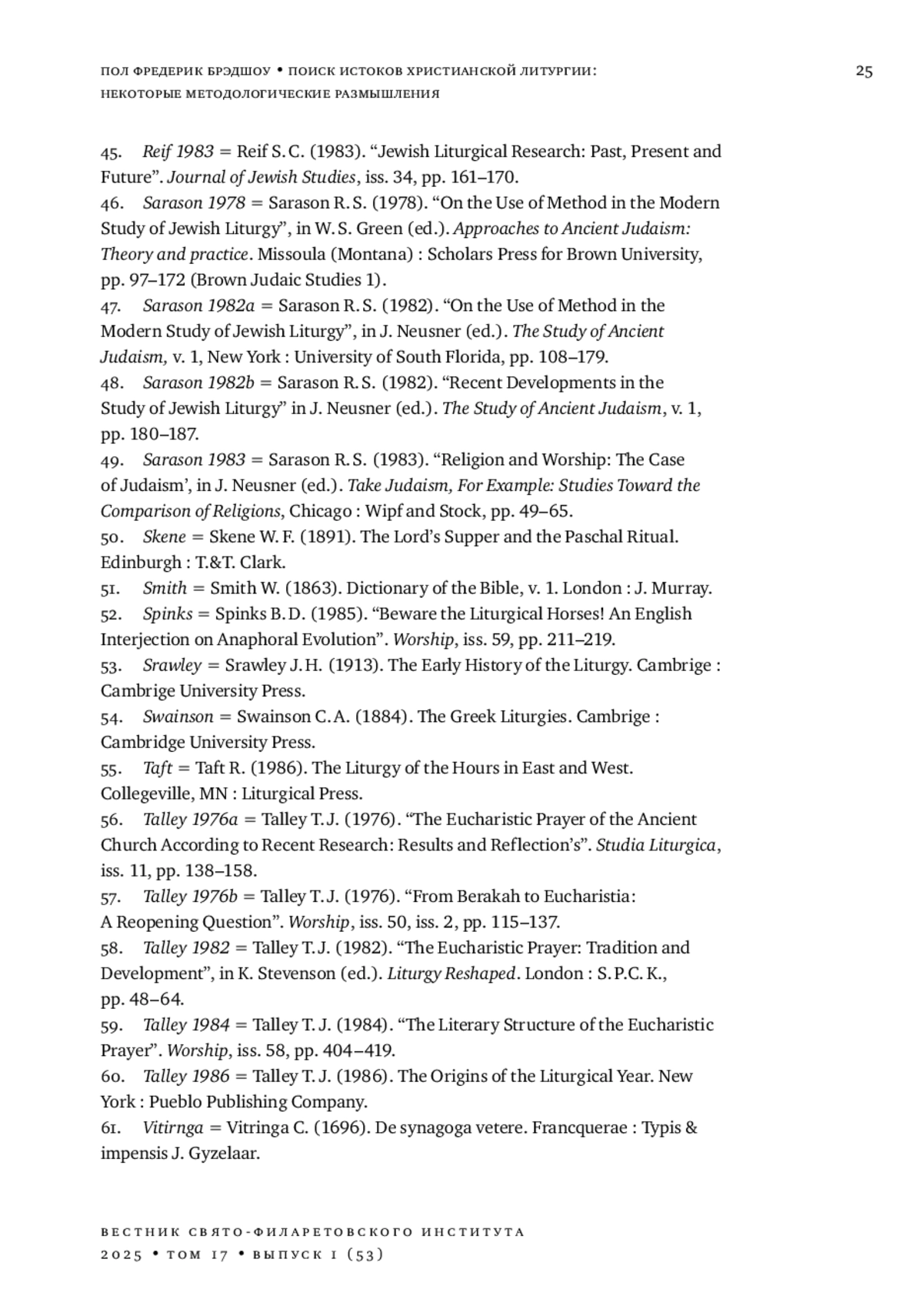 44. Reif S. C. (1982). “Some liturgical issues in the Talmudic Sources”. Studia Liturgica, iss. 15, pp. 188-206.