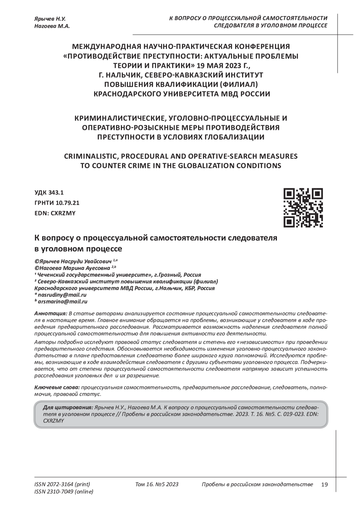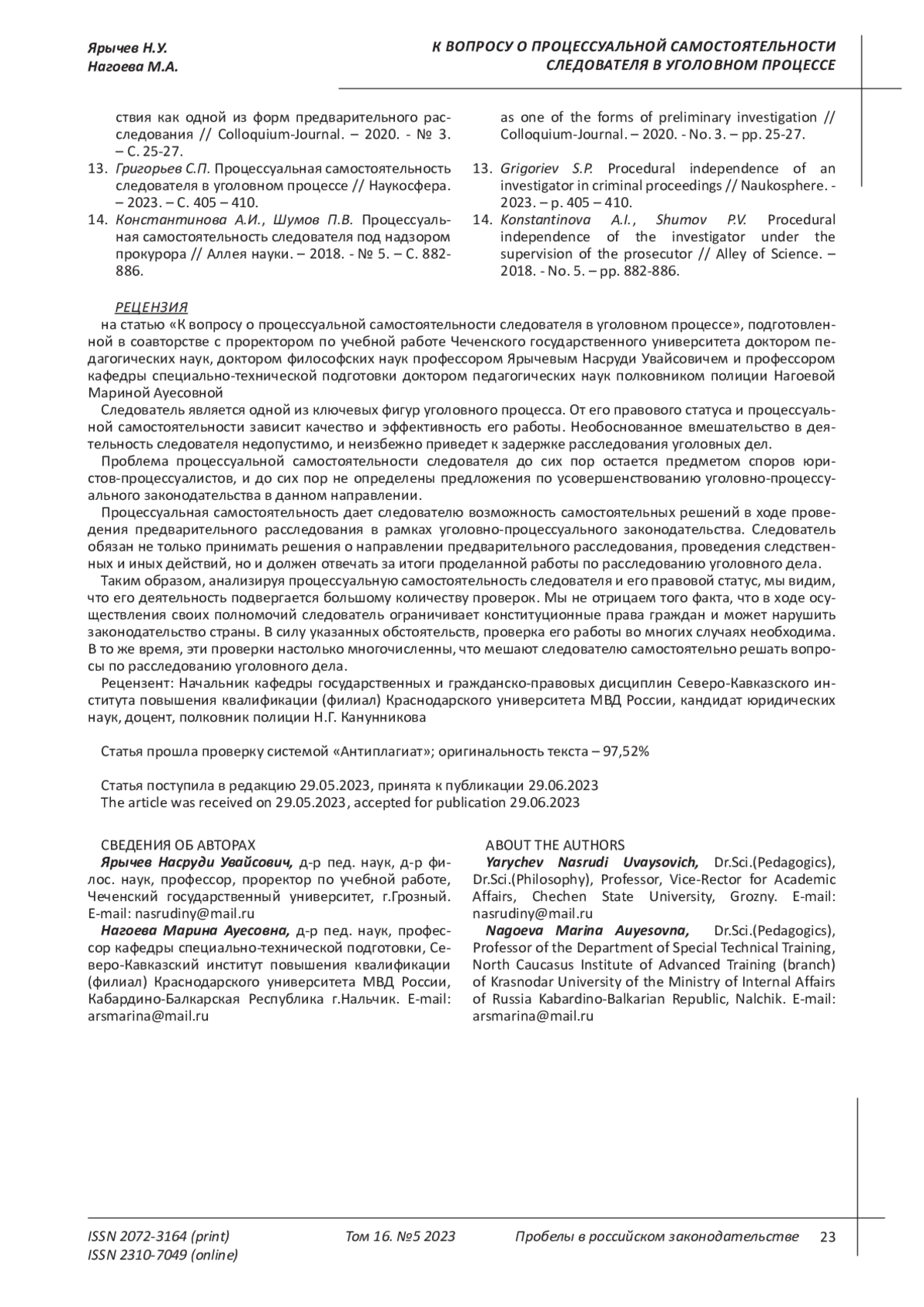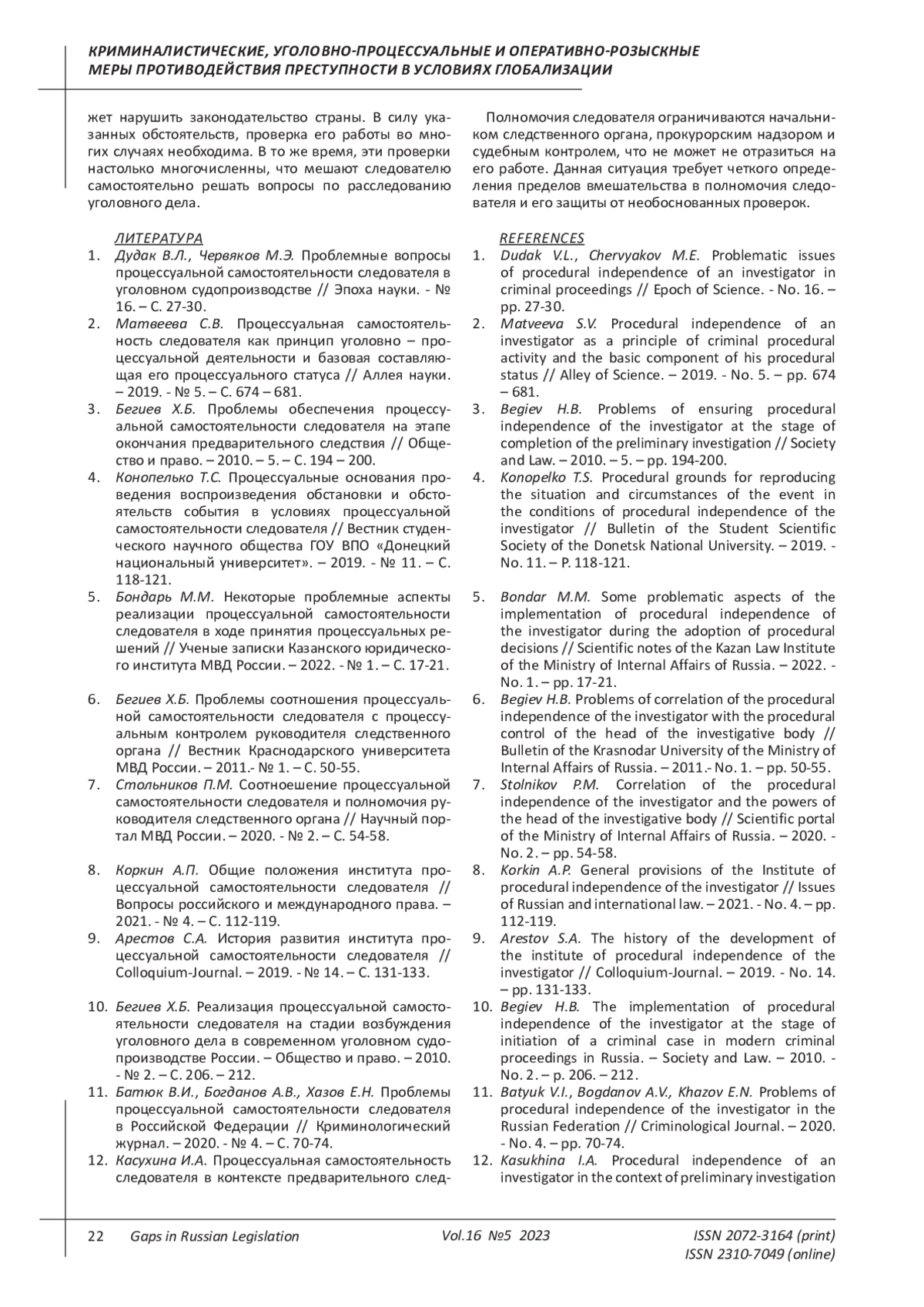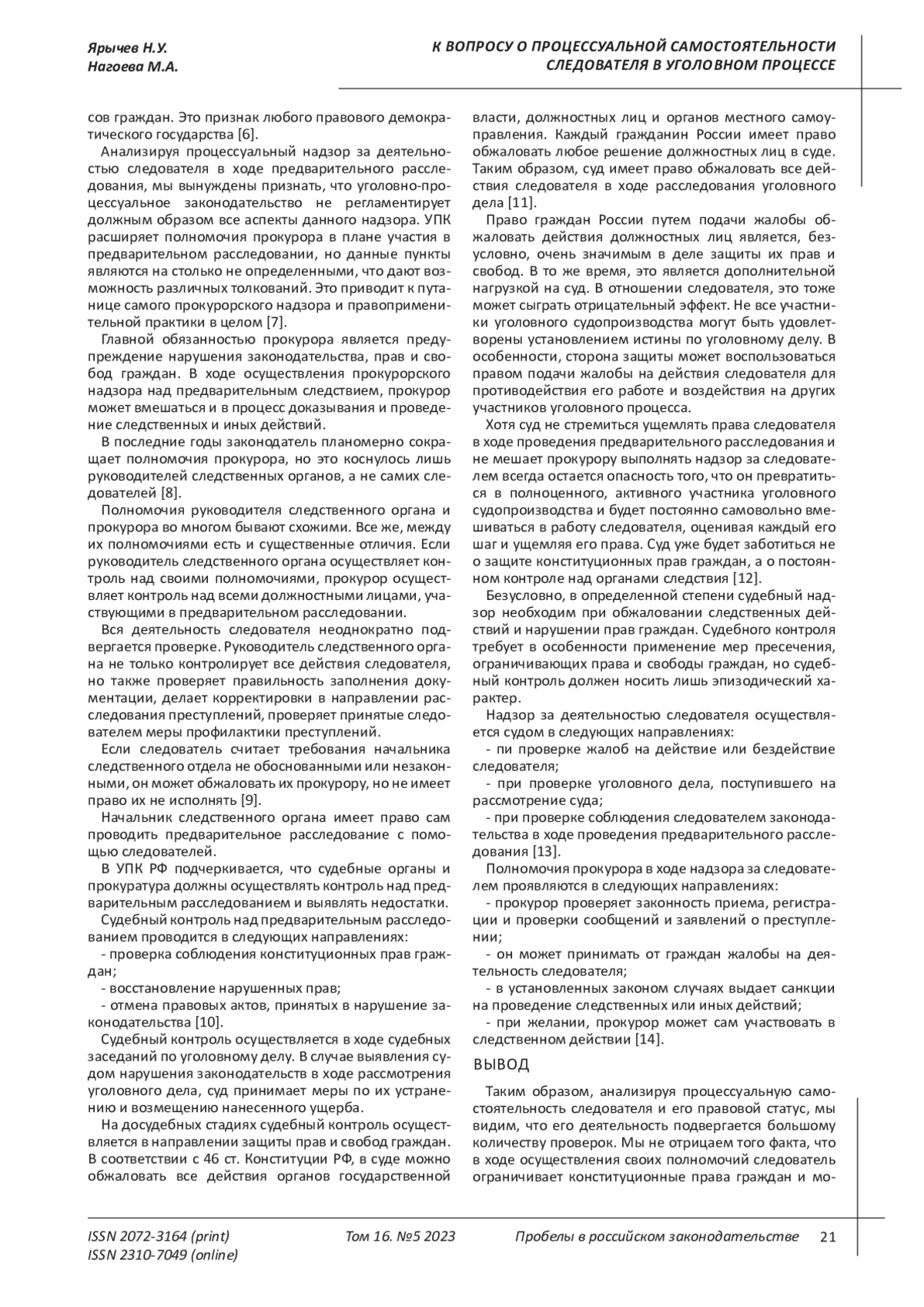 13. Григорьев С.П. Процессуальная самостоятельность следователя в уголовном процессе // Наукосфера. - 2023. - С. 405 - 410. EDN: BHHBWE