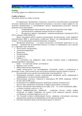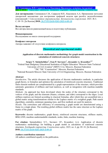 Введение. В статье рассматривается применение методов дискретной математики, в частности теории графов, для формализации и оптимизации расчета железобетонных конструкций. Традиционные методы конечных элементов дополняются графовым представлением структуры, что обеспечивает автоматическую генерацию матриц жесткости и нагрузок, а также интеграцию с машинопонимаемыми стандартами.