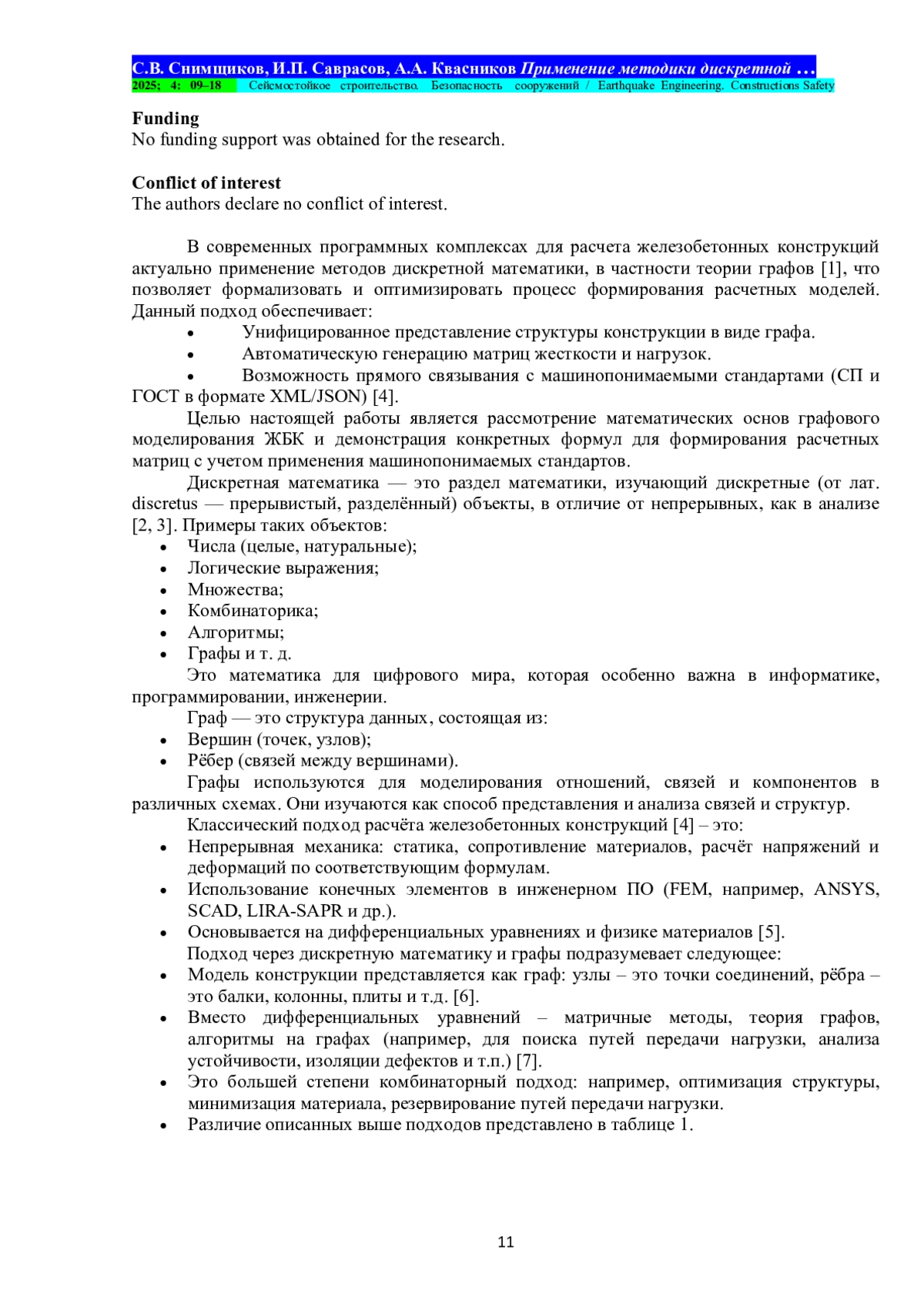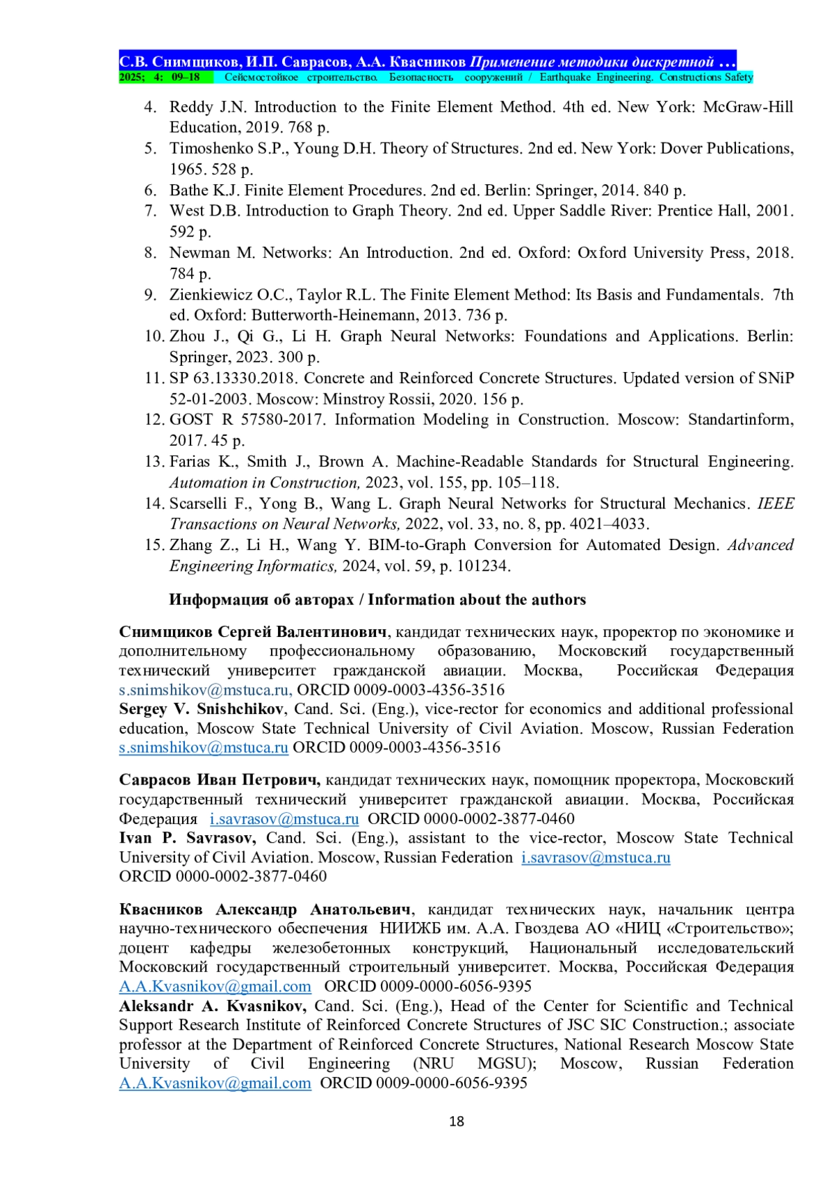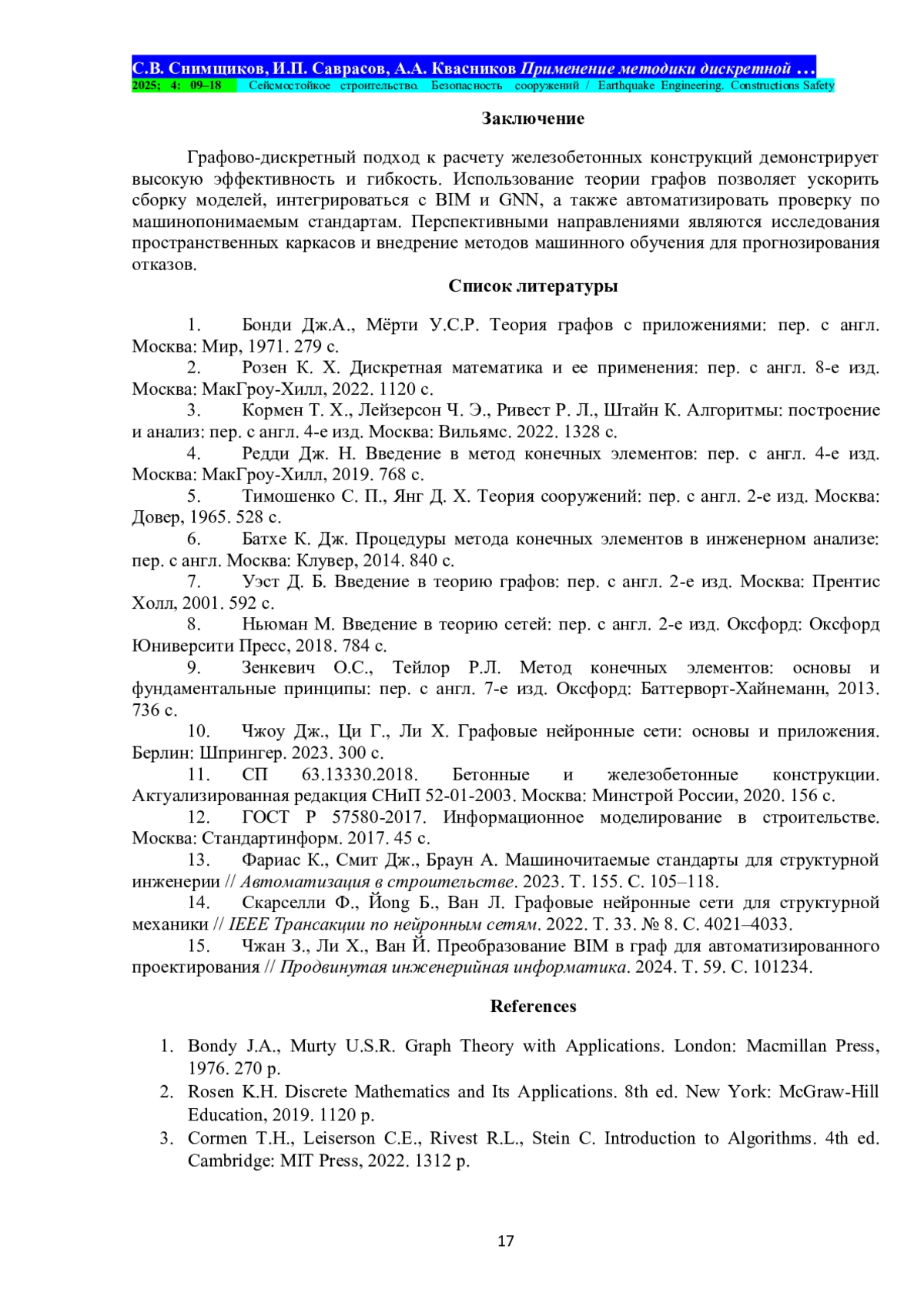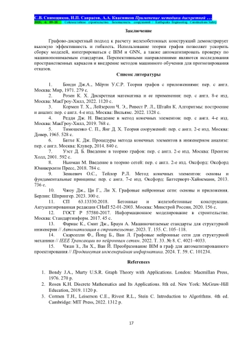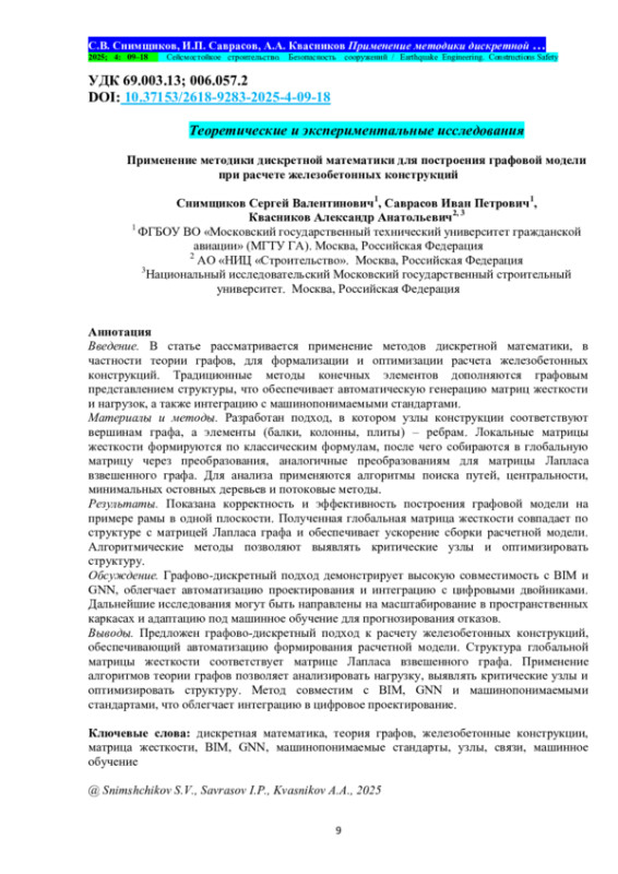 Выводы. Предложен графово-дискретный подход к расчету железобетонных конструкций, обеспечивающий автоматизацию формирования расчетной модели. Структура глобальной матрицы жесткости соответствует матрице Лапласа взвешенного графа. Применение алгоритмов теории графов позволяет анализировать нагрузку, выявлять критические узлы и оптимизировать структуру. Метод совместим с BIM, GNN и машинопонимаемыми стандартами, что облегчает интеграцию в цифровое проектирование.