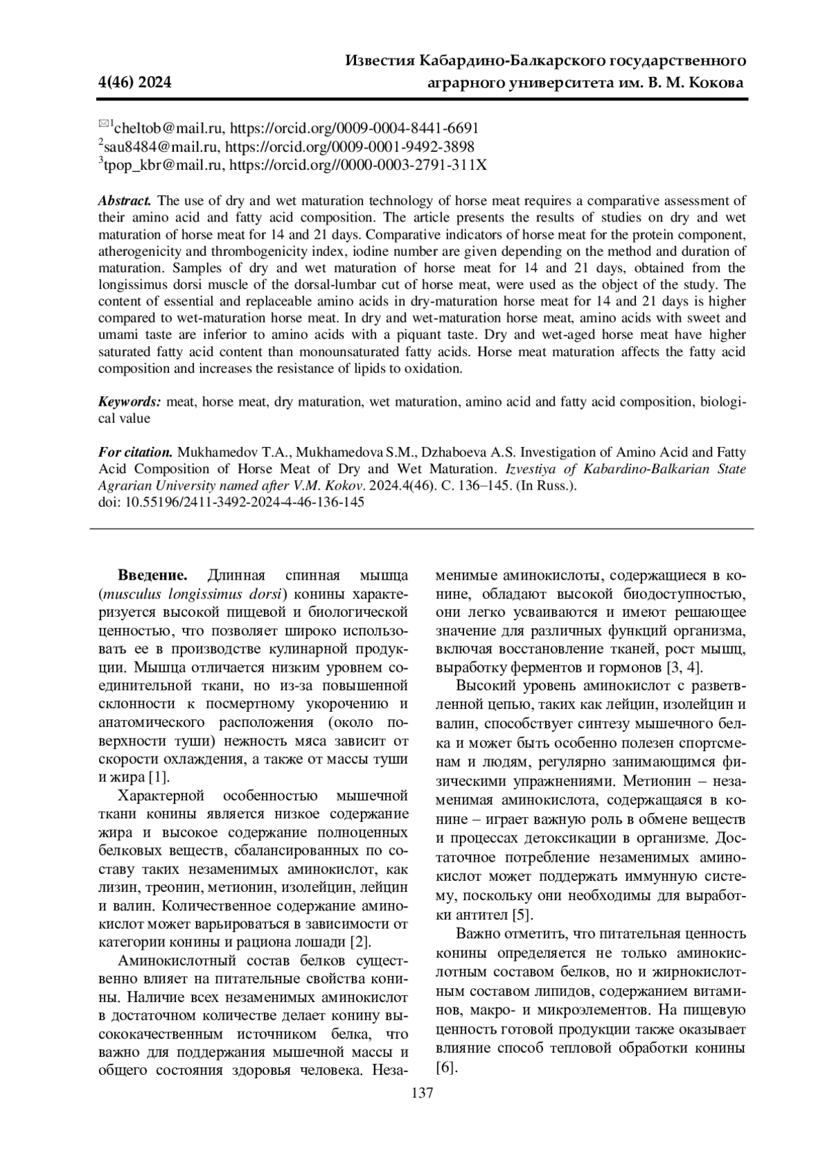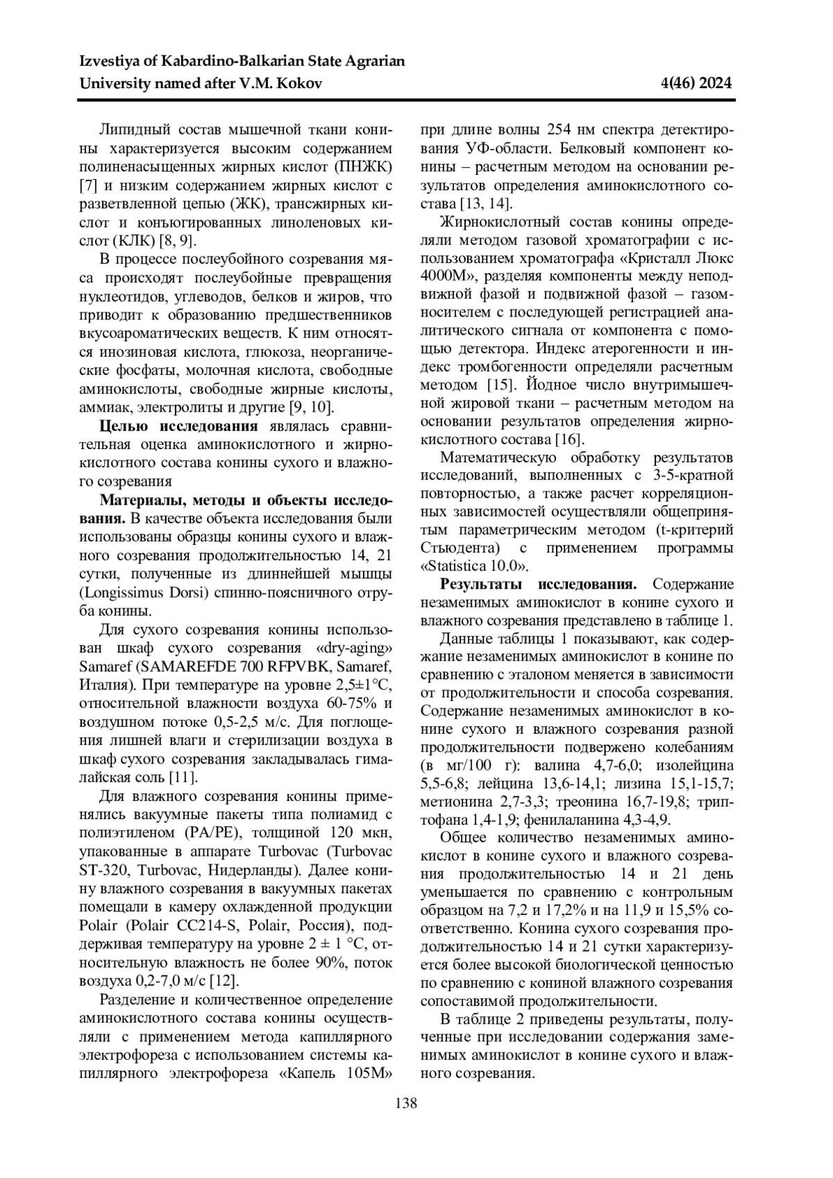 Использование технологии сухого и влажного созревания конины требует сравнительной оценки их аминокислотного и жирнокислотного состава. В статье представлены результаты исследований по сухому и влажному созреванию конины продолжительностью 14 и 21 сутки. Приведены сравнительные показатели конины по белковому компоненту, индексу атерогенности и тромбогенности, йодному числу в зависимости от метода и продолжительности созревания. В качестве объекта исследования были использованы образцы конины сухого и влажного созревания продолжительностью 14, 21 сутки, полученные из длиннейшей мышцы (Longissimus Dorsi) спинно-поясничного отруба конины. Содержание незаменимых и заменимых аминокислот в конине сухого созревания продолжительностью 14 и 21 сутки выше по сравнению с содержанием в конине влажного созревания. В конине сухого и влажного созревания аминокислоты со сладким и вкусом умами уступают аминокислотам с пикантным вкусом. В конине сухого и влажного созревания наблюдаются более высокие значения содержания насыщенных жирных кислот, чем мононенасыщенных кислот. Созревание конины влияет на жирнокислотный состав и повышает устойчивость липидов к окислению.