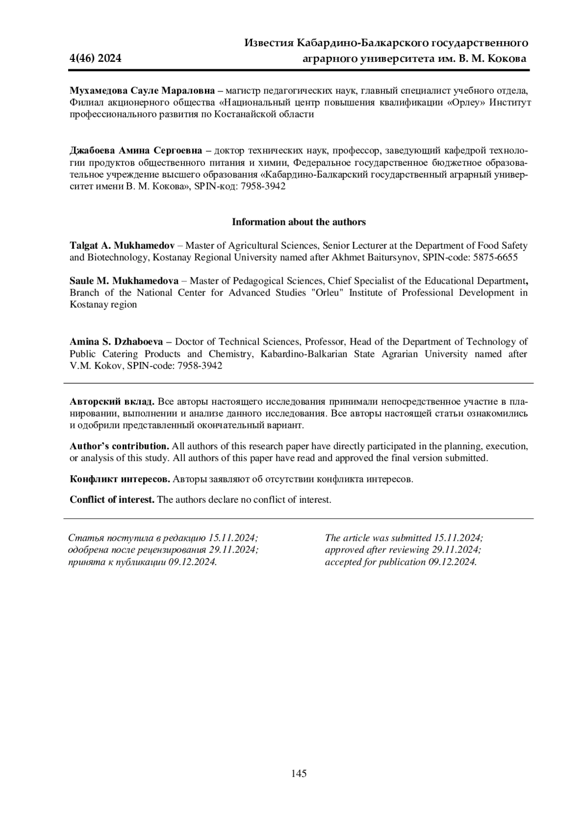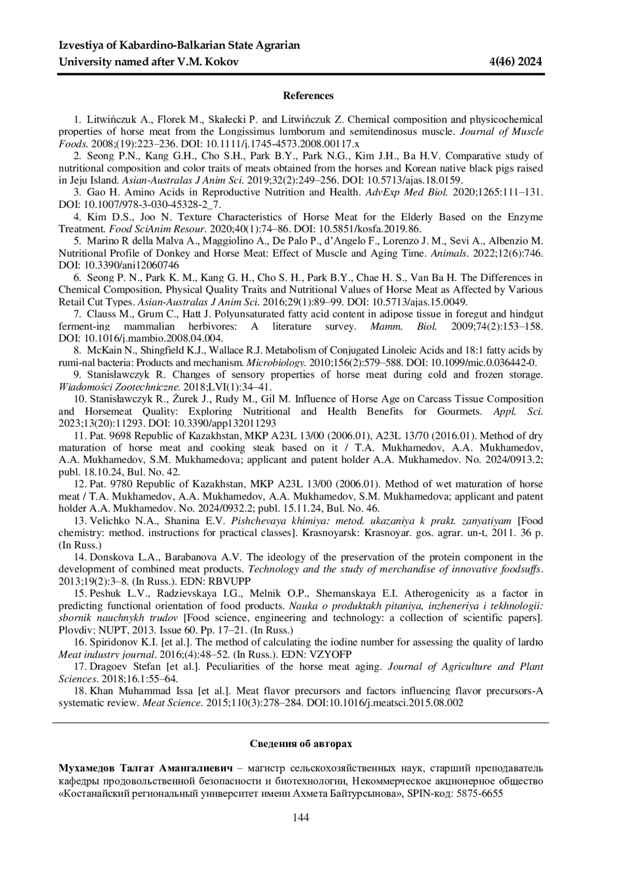 12. Пат. 9780 Республика Казахстан, МКП A23L 13/00 (2006.01). Способ влажного созревания конины / Т. А. Мухамедов, А. А. Мухамедов, А. А. Мухамедов, С. М. Мухамедова; заявитель и патентообладатель А. А. Мухамедов. № 2024/0932.2; опубл. 15.11.24. Бюл. № 46.