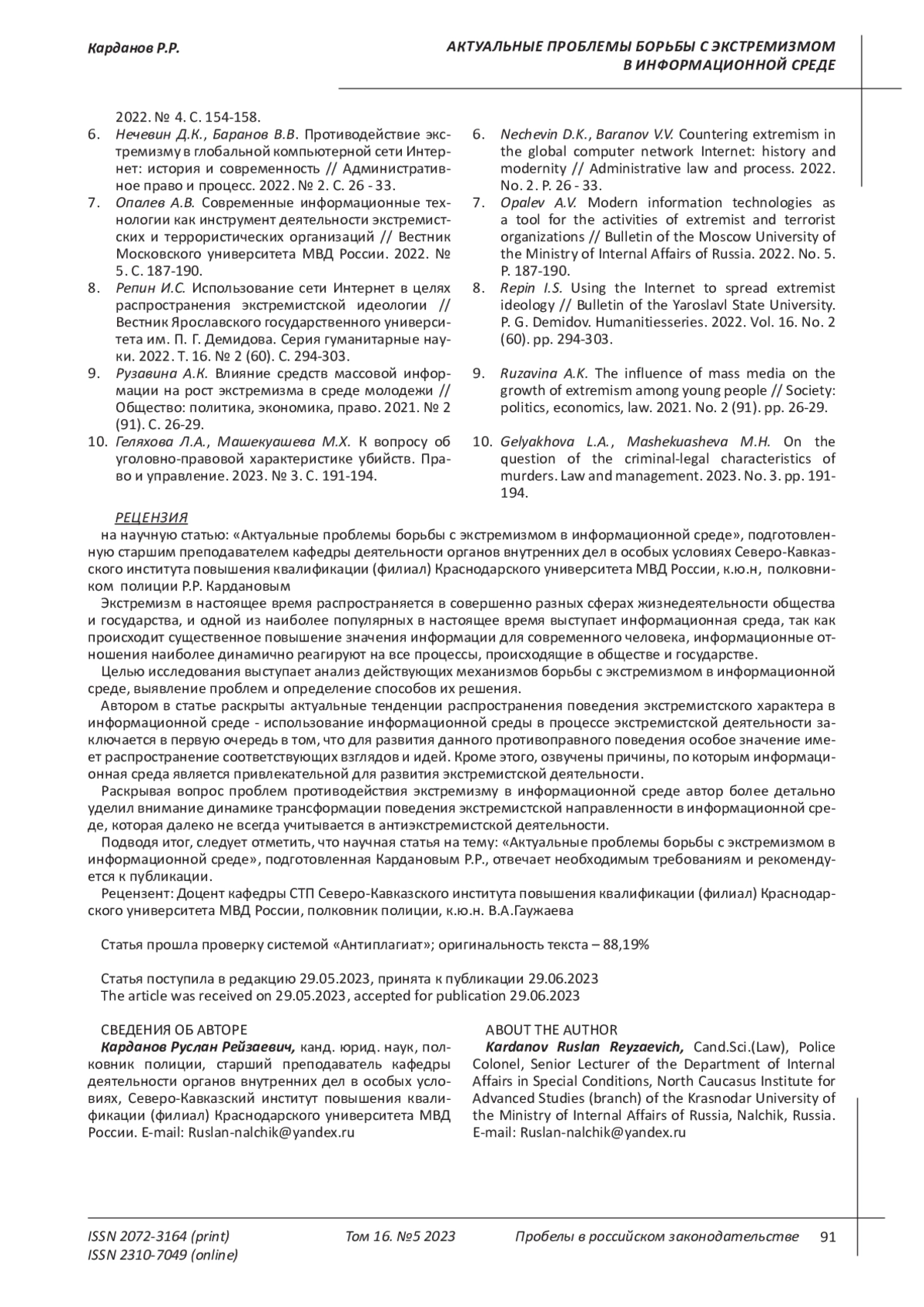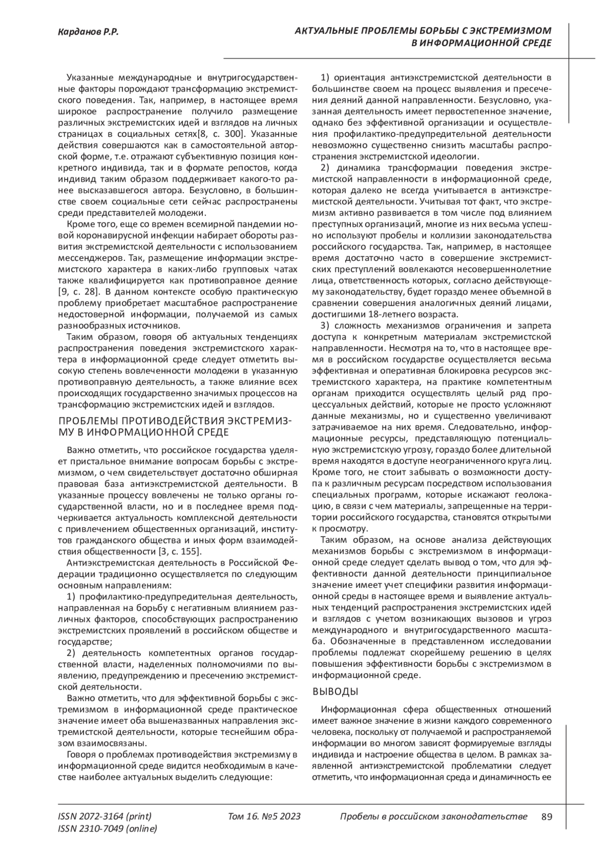 КАРДАНОВ Р. Р. АКТУАЛЬНЫЕ ПРОБЛЕМЫ БОРЬБЫ С ЭКСТРЕМИЗМОМ В ИНФОРМАЦИОННОЙ СРЕДЕ // ПРОБЕЛЫ В РОССИЙСКОМ ЗАКОНОДАТЕЛЬСТВЕ. 2023. Т. 16 № 5