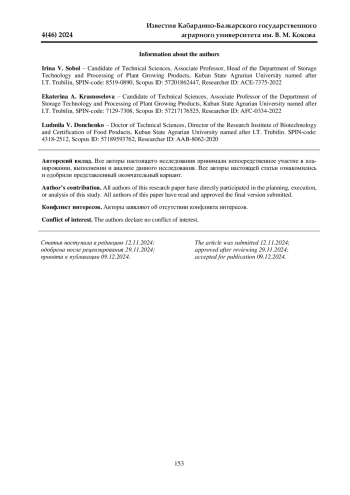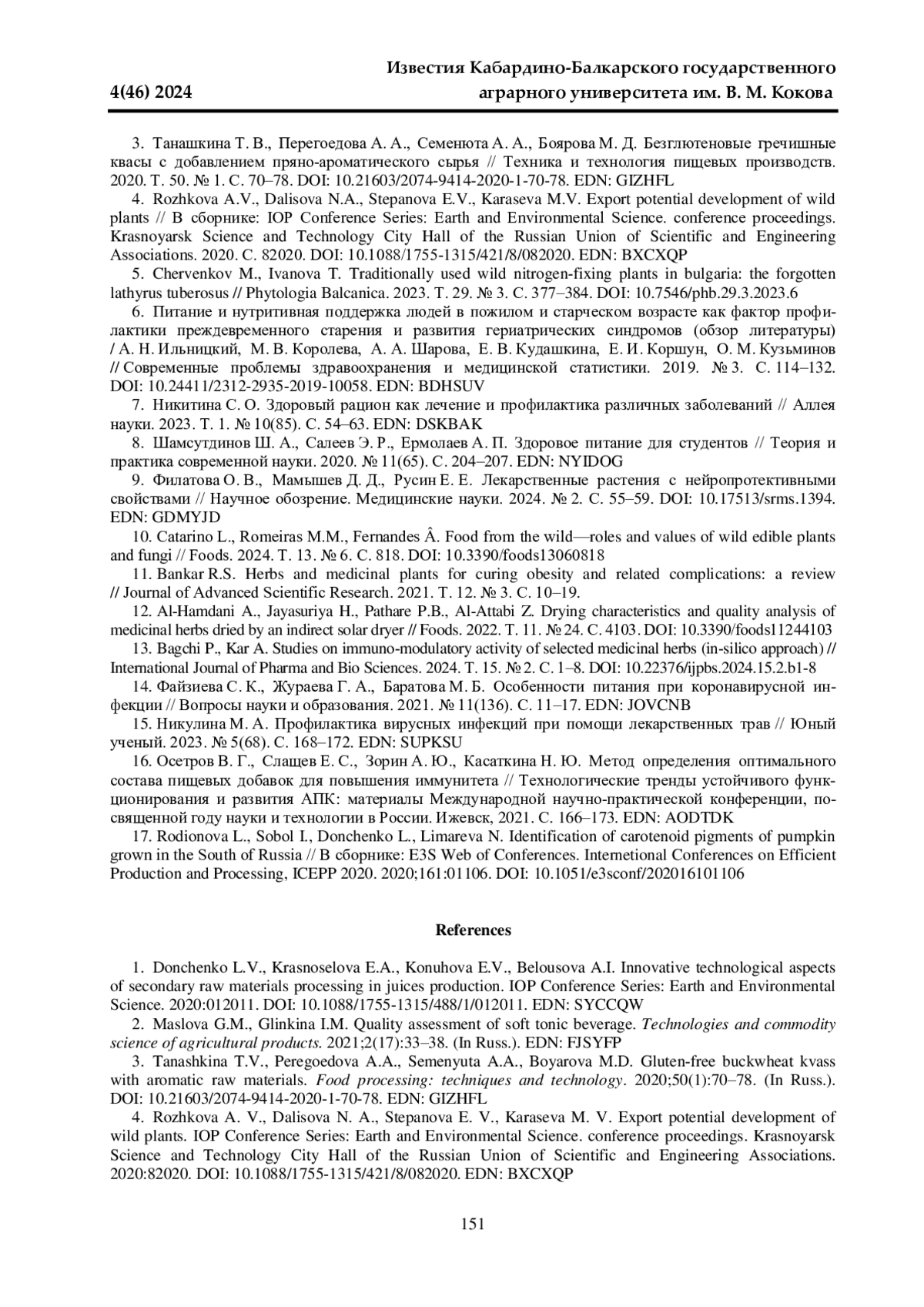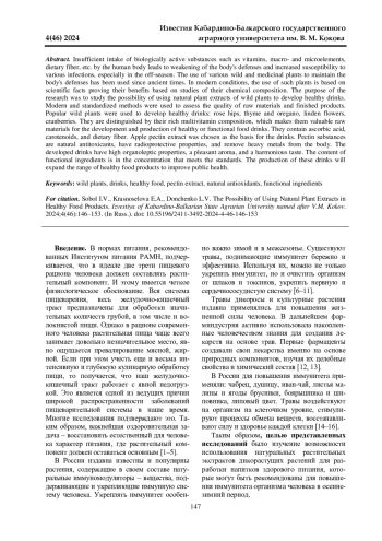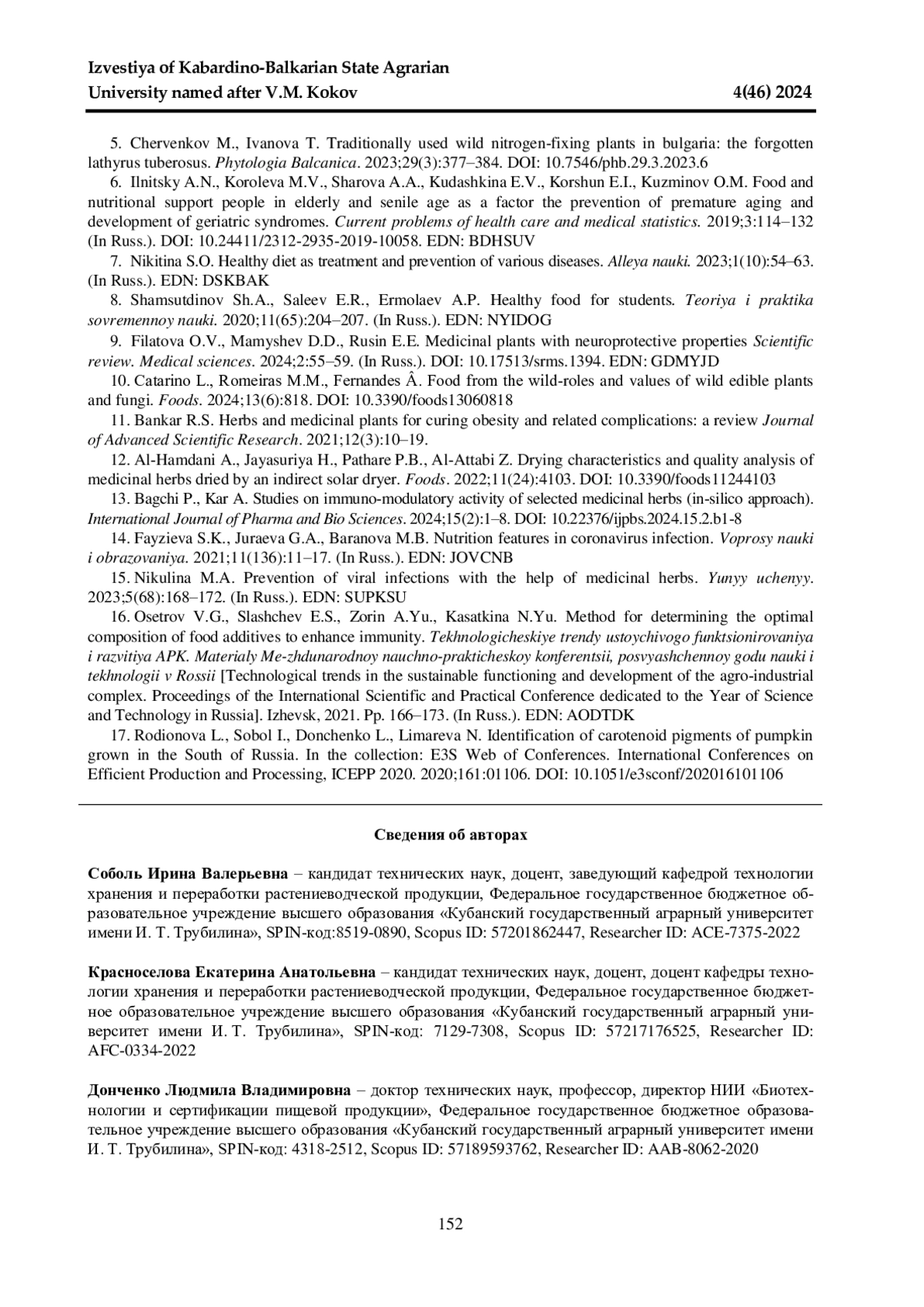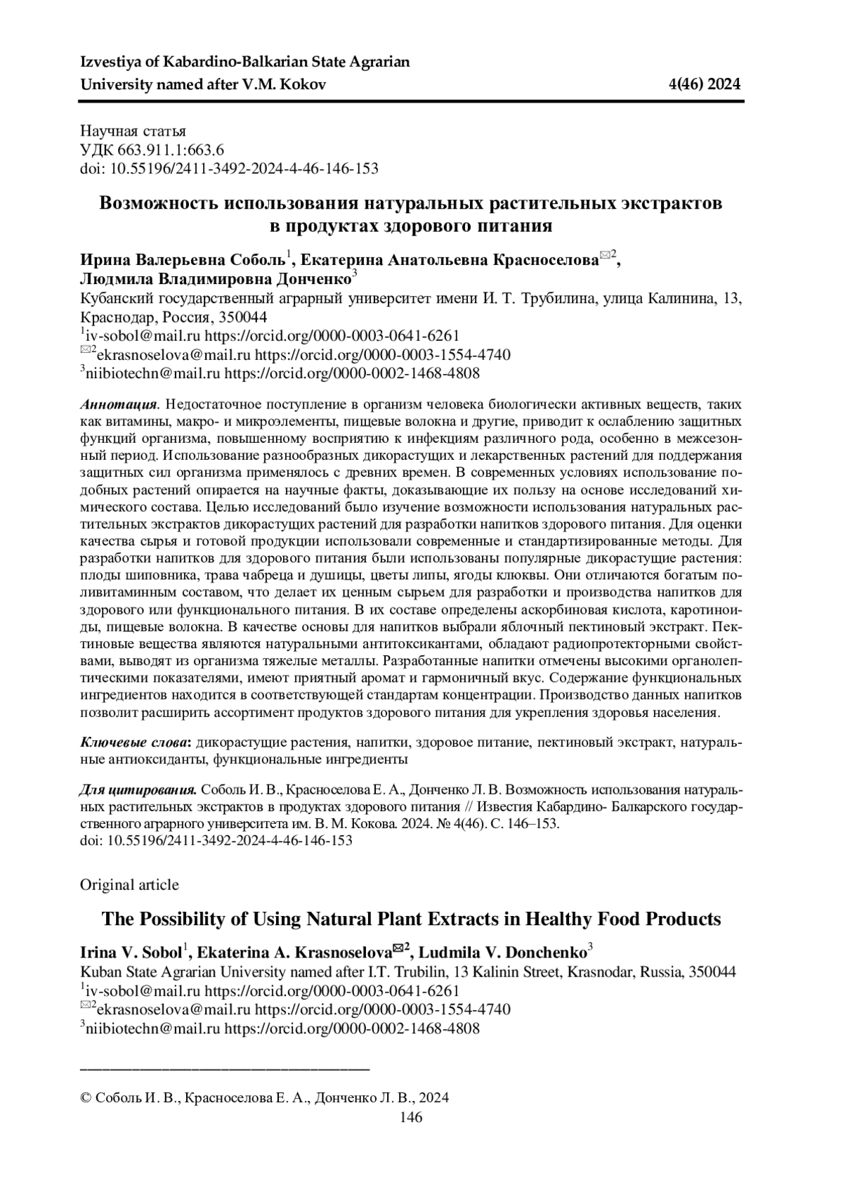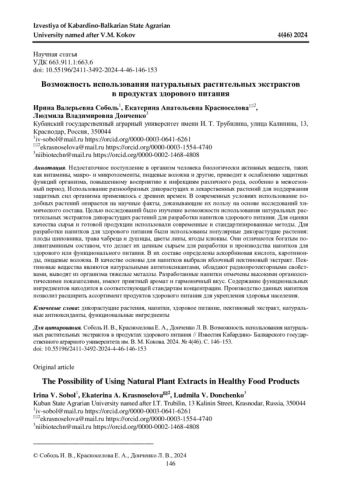 СОБОЛЬ И. В., КРАСНОСЕЛОВА Е. А., ДОНЧЕНКО Л. В. ВОЗМОЖНОСТЬ ИСПОЛЬЗОВАНИЯ НАТУРАЛЬНЫХ РАСТИТЕЛЬНЫХ ЭКСТРАКТОВ В ПРОДУКТАХ ЗДОРОВОГО ПИТАНИЯ // ИЗВЕСТИЯ КАБАРДИНО-БАЛКАРСКОГО ГОСУДАРСТВЕННОГО АГРАРНОГО УНИВЕРСИТЕТА ИМ. В. М. КОКОВА. 2024. № 4 (46)