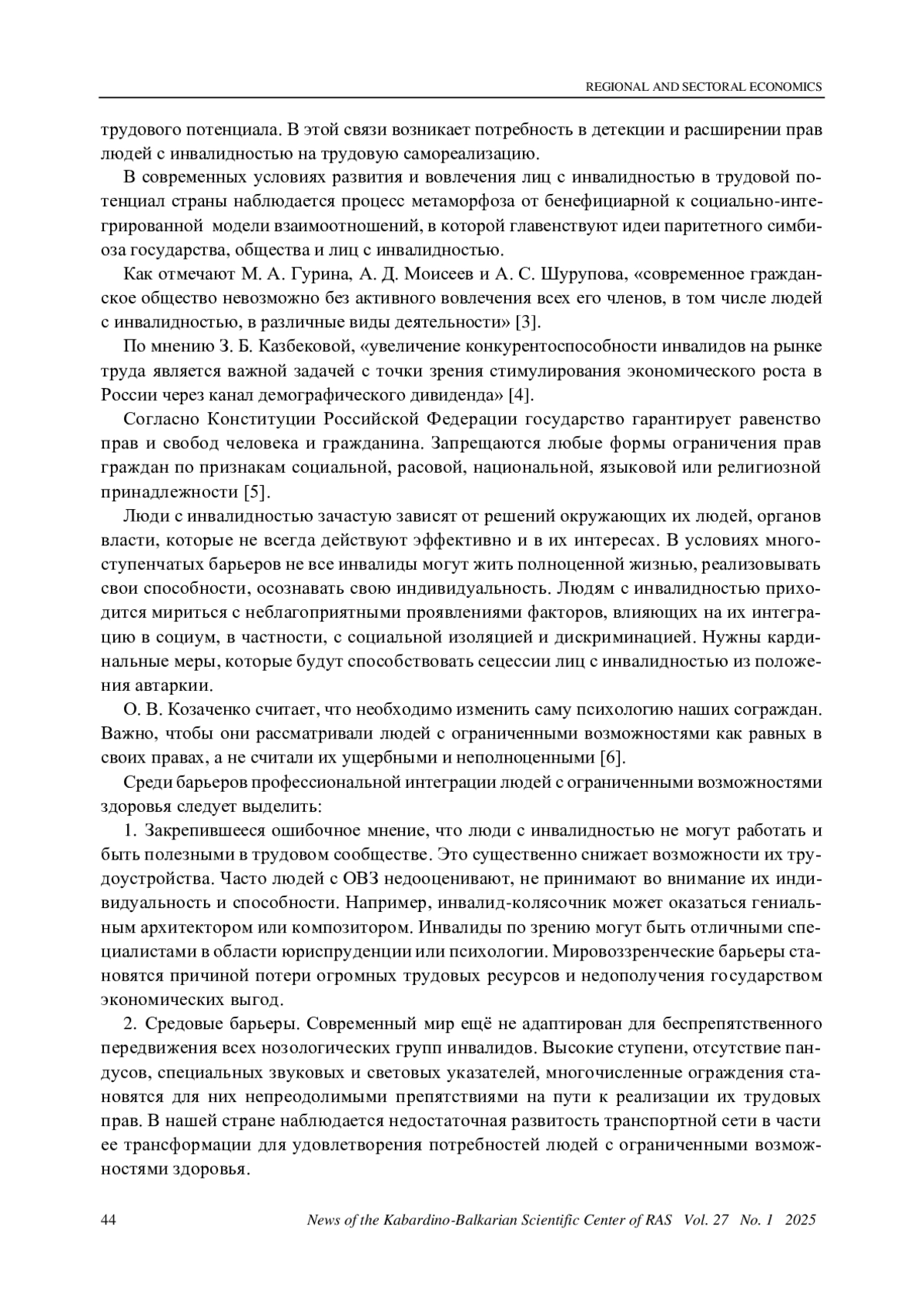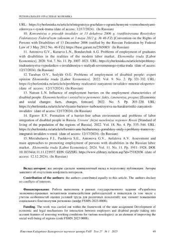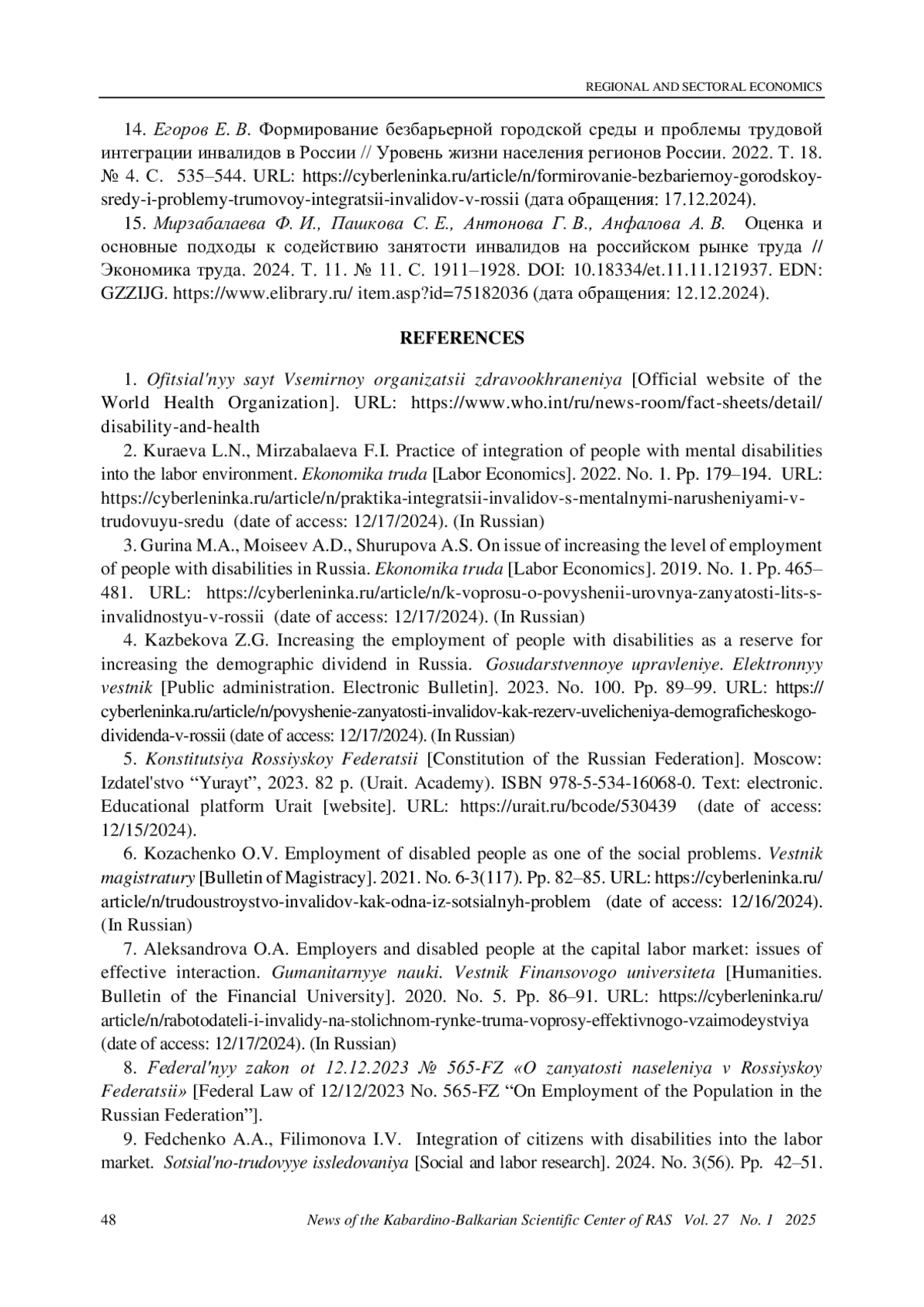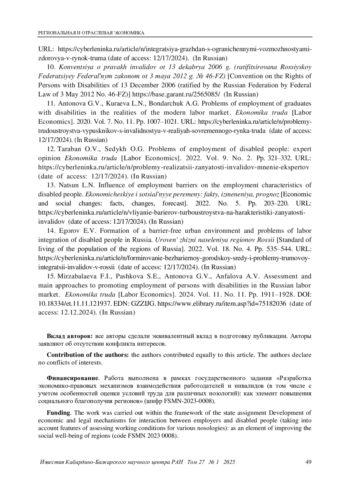 15. Мирзабалаева Ф. И., Пашкова С. Е., Антонова Г. В., Анфалова А. В. Оценка и основные подходы к содействию занятости инвалидов на российском рынке труда // Экономика труда. 2024. Т. 11. № 11. С. 1911-1928. item.asp?id=75182036 (дата обращения: 12.12.2024). DOI: 10.18334/et.11.11.121937 EDN: GZZIJG