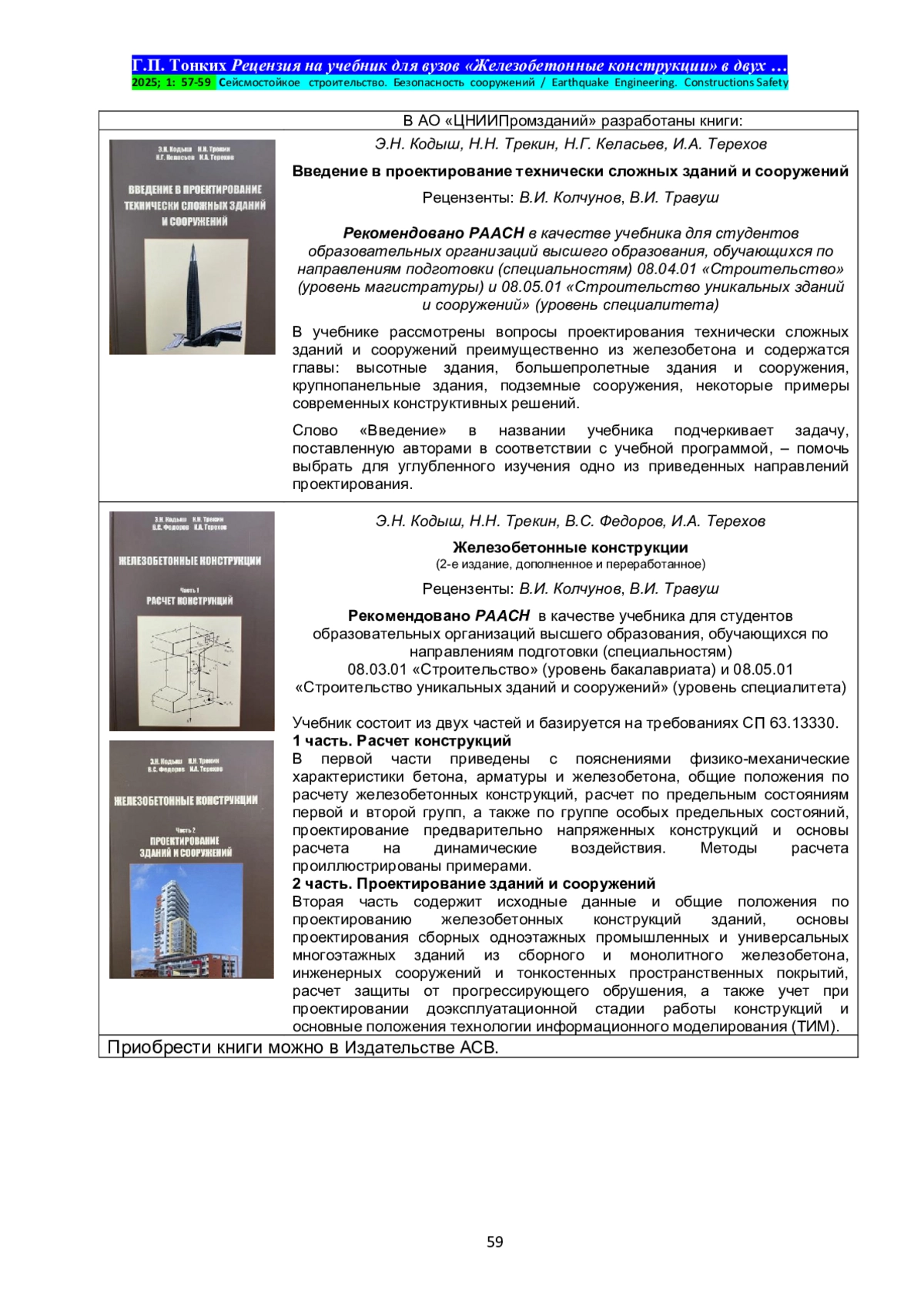 Издательство АСВ выпустило учебник для вузов «Железобетонные конструкции», состоящий из двух частей. Первая часть учебника «Расчет конструкций» содержит 388 страниц текста; вторая часть «Проектирование зданий и сооружений» – 380 страниц. Книга подготовлена коллективом авторов из организаций АО «ЦНИИПромзданий», НИУ МГСУ и РУТ (МИИТ).