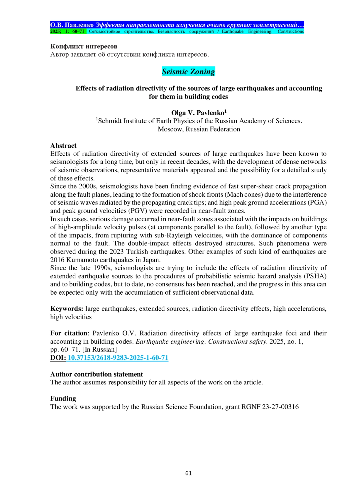 9. Somerville P. Magnitude scaling of the near fault rupture directivity pulse. Physics of the Earth and Planetary Interiors. 2003, vol. 137, no. 1-4, pp. 201-212. DOI: 10.1016/S0031-9201(03)00015-3