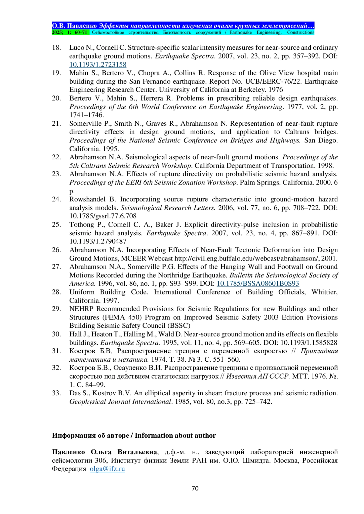 25. Tothong P., Cornell C. A., Baker J. Explicit directivity-pulse inclusion in probabilistic seismic hazard analysis. Earthquake Spectra. 2007, vol. 23, no. 4, pp. 867-891. DOI: 10.1193/1.2790487