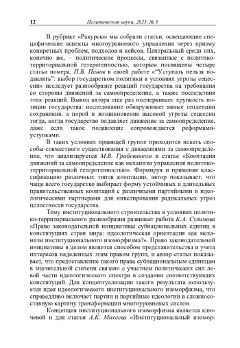 В рубрике «Ракурсы» мы собрали статьи, освещающие специфические аспекты многоуровневого управления через призму конкретных проблем, подходов и кейсов. Центральный среди них, конечно же, – политические процессы, связанные с политикотерриториальной гетерогенностью, которым посвящены четыре статьи номера.