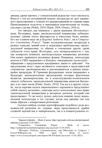Наличие этого права в конституции страны ничего не говорит нам о его реальном использовании, а главное – о том, какое место оно занимает в общей системе центр-периферийных отношений. Можно лишь установить его место в конституционном дизайне. Также важно, что право законодательной инициативы является дополнительным, обеспечивающим институтом. Его наличие или отсутствие в конституции едва ли может быть важным типологическим признаком.