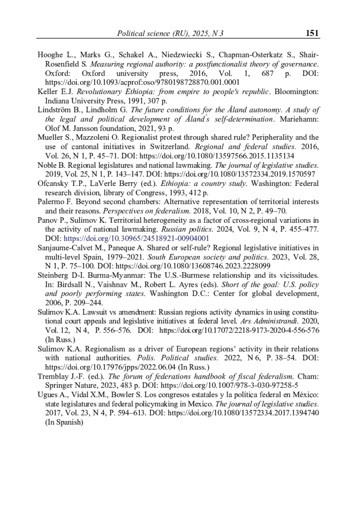 3. Сулимов К.А. Регионализм как драйвер активности европейских регионов в отношениях с центром // Полис. Политические исследования. - 2022. - № 6. - С. 38-54. - https://doi.org/10.17976/jpps/2022.06.04