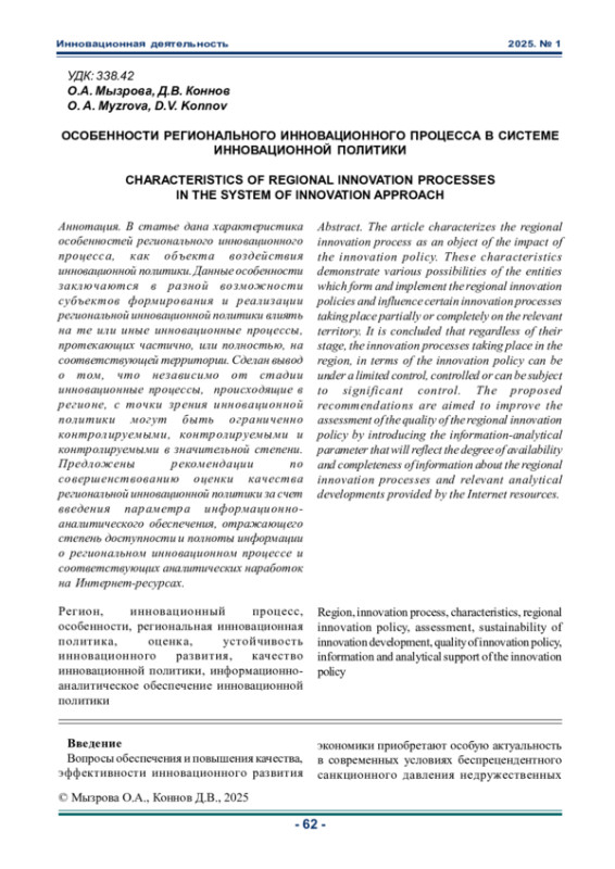 Регион, инновационный процесс, особенности, региональная инновационная политика, оценка, устойчивость инновационного развития, качество инновационной политики, информационноаналитическое обеспечение инновационной политики государств, генерирующего как новые и многократно возросшие вызовы и угрозы для научно-технологической сферы, так и новые возможности для развития последней.