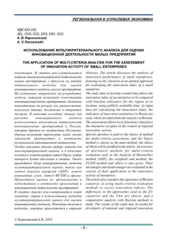 КЕРОСИНСКИЙ А. В. ИСПОЛЬЗОВАНИЕ МУЛЬТИКРИТЕРИАЛЬНОГО АНАЛИЗА ДЛЯ ОЦЕНКИ ИННОВАЦИОННОЙ ДЕЯТЕЛЬНОСТИ МАЛЫХ ПРЕДПРИЯТИЙ // ИННОВАЦИОННАЯ ДЕЯТЕЛЬНОСТЬ. 2025. № 2 (73)