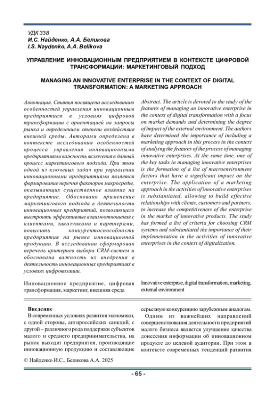 Статья посвящена исследованию особенностей управления инновационным предприятием в условиях цифровой трансформации с ориентацией на запросы рынка и определением степени воздействия внешней среды. Авторами определена в контексте исследования особенностей процесса управления инновационными предприятиями важность включения в данный процесс маркетингового подхода. При этом одной из ключевых задач при управлении инновационными предприятиями является формирование перечня факторов макросреды, оказывающих существенное влияние на предприятие. Обосновано применение маркетингового подхода в деятельности инновационных предприятий, позволяющего выстроить эффективные взаимоотношения с клиентами, заказчиками и партнерами, повысить конкурентоспособность предприятия на рынке инновационной продукции. В исследовании сформирован перечень критериев выбора CRM-систем и обоснована важность их внедрения в деятельность инновационных предприятиях в условиях цифровизации.