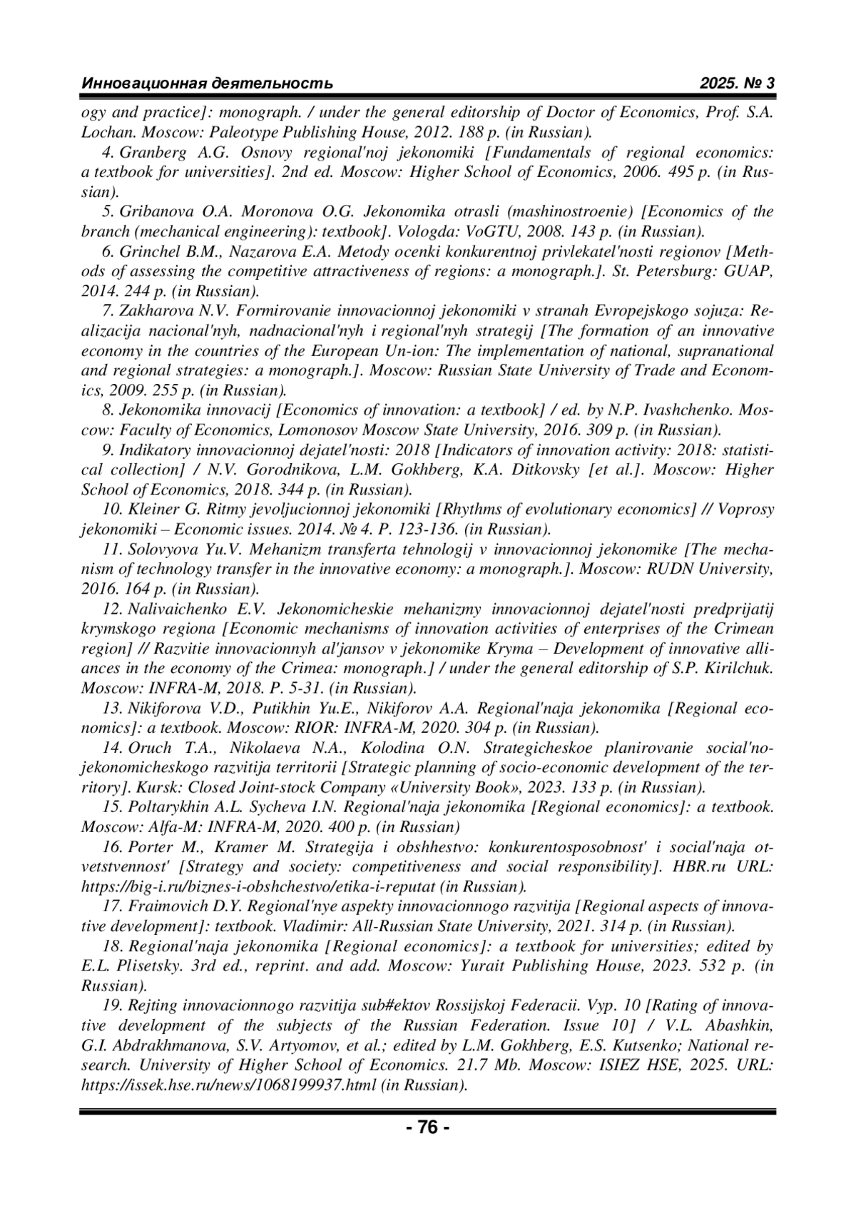 ЧЕБЫКИНА М. В. РЕГИОНАЛЬНЫЕ ПРОМЫШЛЕННЫЕ СИСТЕМЫ В КОНТЕКСТЕ ИННОВАЦИОННОГО РАЗВИТИЯ ЭКОНОМИКИ // ИННОВАЦИОННАЯ ДЕЯТЕЛЬНОСТЬ. 2025. № 3 (74)
