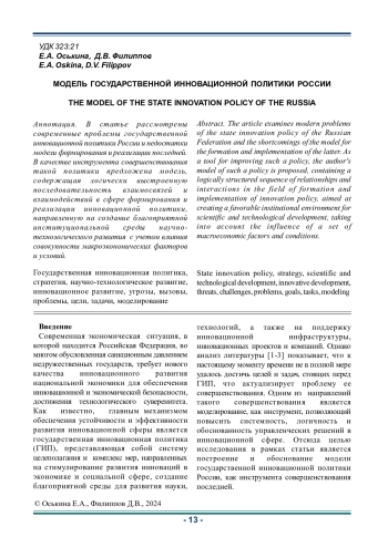 ОСЬКИНА Е. А., ФИЛИППОВ Д. В. МОДЕЛЬ ГОСУДАРСТВЕННОЙ ИННОВАЦИОННОЙ ПОЛИТИКИ РОССИИ // ИННОВАЦИОННАЯ ДЕЯТЕЛЬНОСТЬ. 2024. № 1 (68)