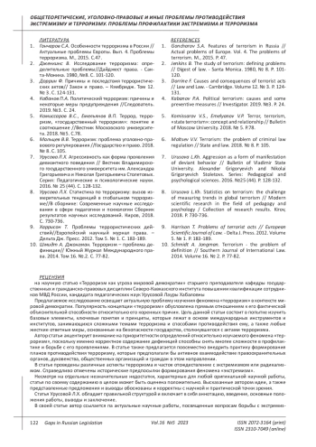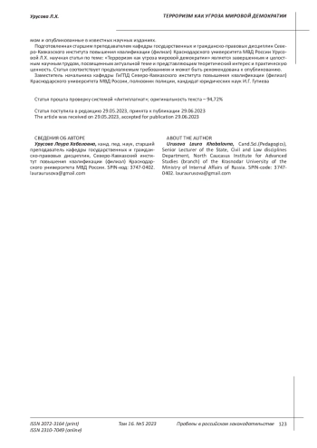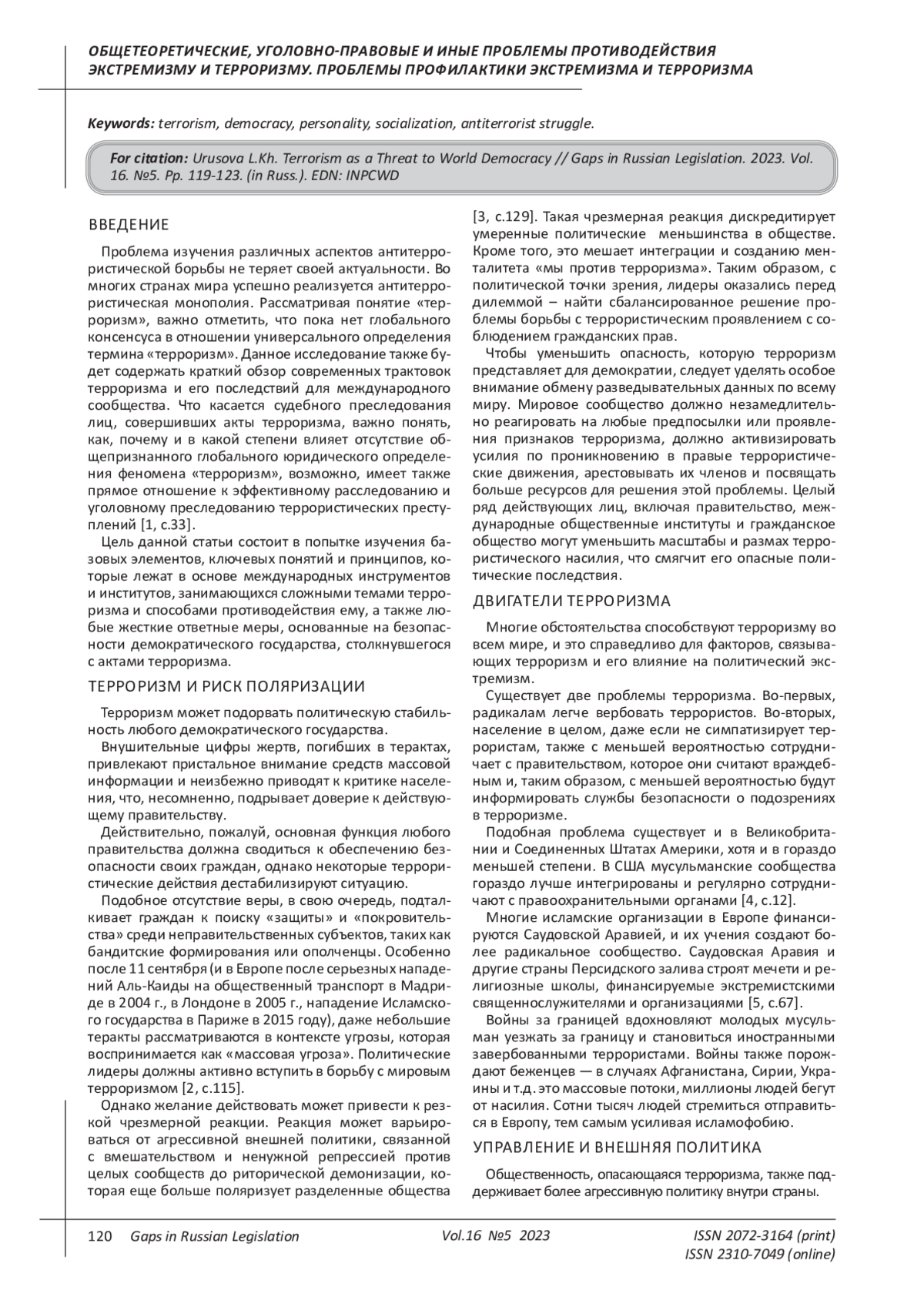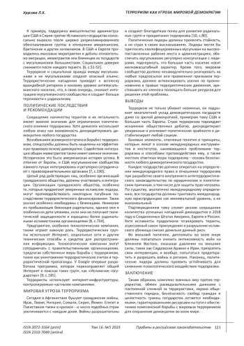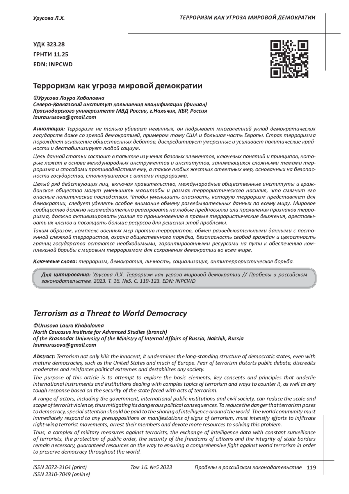 УРУСОВА Л. Х. ТЕРРОРИЗМ КАК УГРОЗА МИРОВОЙ ДЕМОКРАТИИ // ПРОБЕЛЫ В РОССИЙСКОМ ЗАКОНОДАТЕЛЬСТВЕ. 2023. Т. 16 № 5
