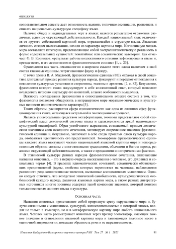 Статья посвящена проблеме национально-культурной специфики фразеологизмов с компонентом названий домашних и диких животных в разноструктурных языках. Сопоставительный анализ карачаево-балкарского и ингушского языков позволяет отразить уникальную способность народа улавливать и фиксировать то или иное сходство, расхождения между человеком и животным миром. В работе выявлены особенности метафорического использования животного мира для характеристики человека. Образ животных помогает создать яркую картину человеческих морально-нравственных качеств носителей исследуемых языков. Актуальность исследования определяется необходимостью изучения фразеологических единиц с компонентом названий домашних и диких животных в карачаево-балкарском и ингушском языках с целью выявления общих и специфических признаков, присущих данным языковым культурам. Это особенно актуально для современной лингвистики по причине еще небольшого количества специальных исследований со сравнительно-сопоставительным анализом анималистической коннотации и концептуальной метафоры в разносистемных языках. Научная новизна исследования заключается в том, что впервые предпринимается попытка сравнительно-сопоставительного анализа фразеологизмов с компонентом названий домашних и диких животных разноструктурных языков с точки зрения их национально-культурной специфики. Статья написана с целью провести сопоставительный анализ фразеологических единиц, выражений, идиом с названиями домашних и диких (хищных) животных на материале карачаево-балкарского и ингушского языков. Методологической основой исследования послужили теоретические работы, касающиеся классификации и семантического анализа фразеологизмов, которые представляют собой не только устойчивые сочетания слов с осложненной семантикой, но и единицы ментальной репрезентации. Делается акцент на том, что во фразеологических единицах c названиями домашних и диких животных заложена культурно значимая информация, которая выражается как в денотативном, так и в коннотативном аспектах значения. Материалом для исследования послужили фактологический материал из различных лексикографических источников, а также тексты из некоторых жанров фольклора, опубликованные в академических и хрестоматийных научных изданиях.