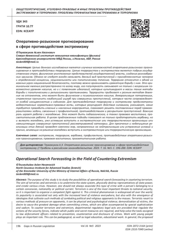 ТЕУВАЖУКОВ А. Х. ОПЕРАТИВНО-РОЗЫСКНОЕ ПРОГНОЗИРОВАНИЕ В СФЕРЕ ПРОТИВОДЕЙСТВИЯ ЭКСТРЕМИЗМУ // ПРОБЕЛЫ В РОССИЙСКОМ ЗАКОНОДАТЕЛЬСТВЕ. 2023. Т. 16 № 5