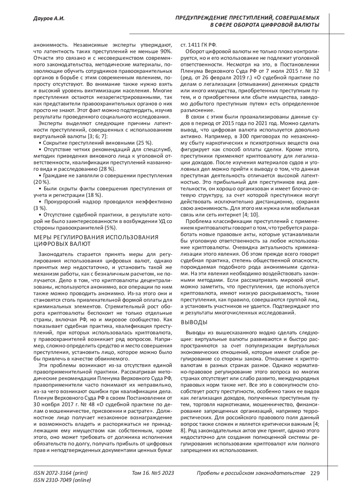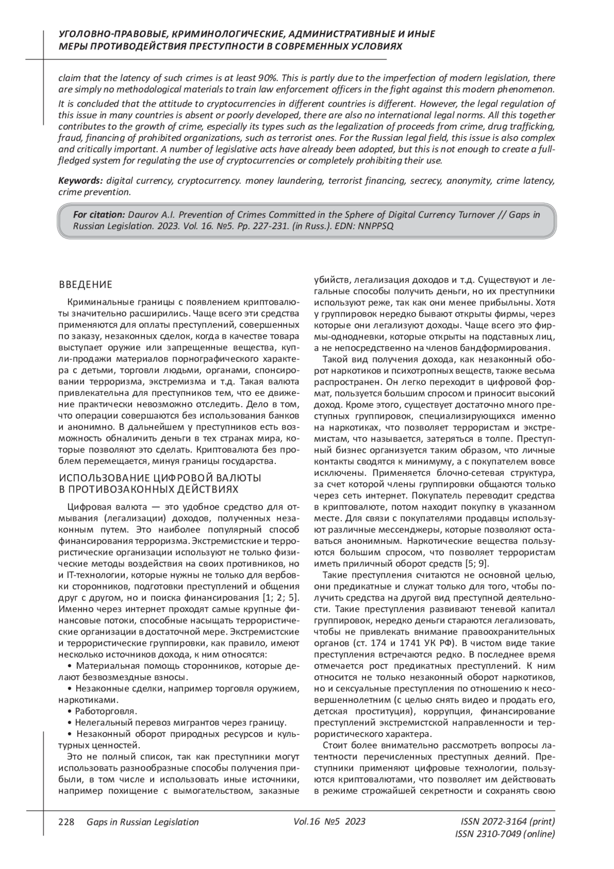 Pinkevich T.V. Prevention of crimes committed in the sphere of turnover of digital currency (cryptocurrency) // The Rule of law: theory and practice. 2021. No. 4 (66). pp. 82-96.