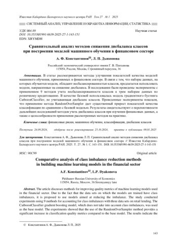 В статье рассматриваются методы улучшения показателей качества моделей машинного обучения, применяемых в финансовом секторе. В связи с тем, что наборы данных, на которых обучаются модели, обладают несбалансированностью классов, предлагается использовать модели, направленные на снижение дисбаланса. В исследовании были проведены эксперименты с применением 9 методов учета несбалансированности классов к трем наборам данных по розничному кредитованию. В качестве базовой использовалась модель градиентного бустинга CatboostClassifier, не учитывающая дисбаланс классов. Проведенные эксперименты показали, что применение метода RandomOverSampler дает существенный прирост показателей качества классификации по сравнению с базовой моделью. Результаты свидетельствуют о перспективности дальнейших исследований методов учета дисбаланса классов при изучении финансовых данных, а также о целесообразности применения рассмотренных методов на практике.