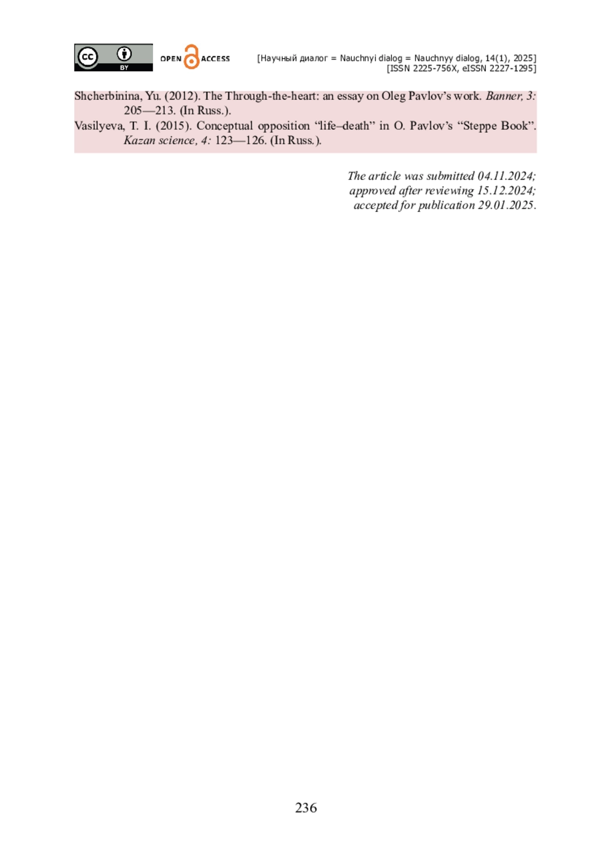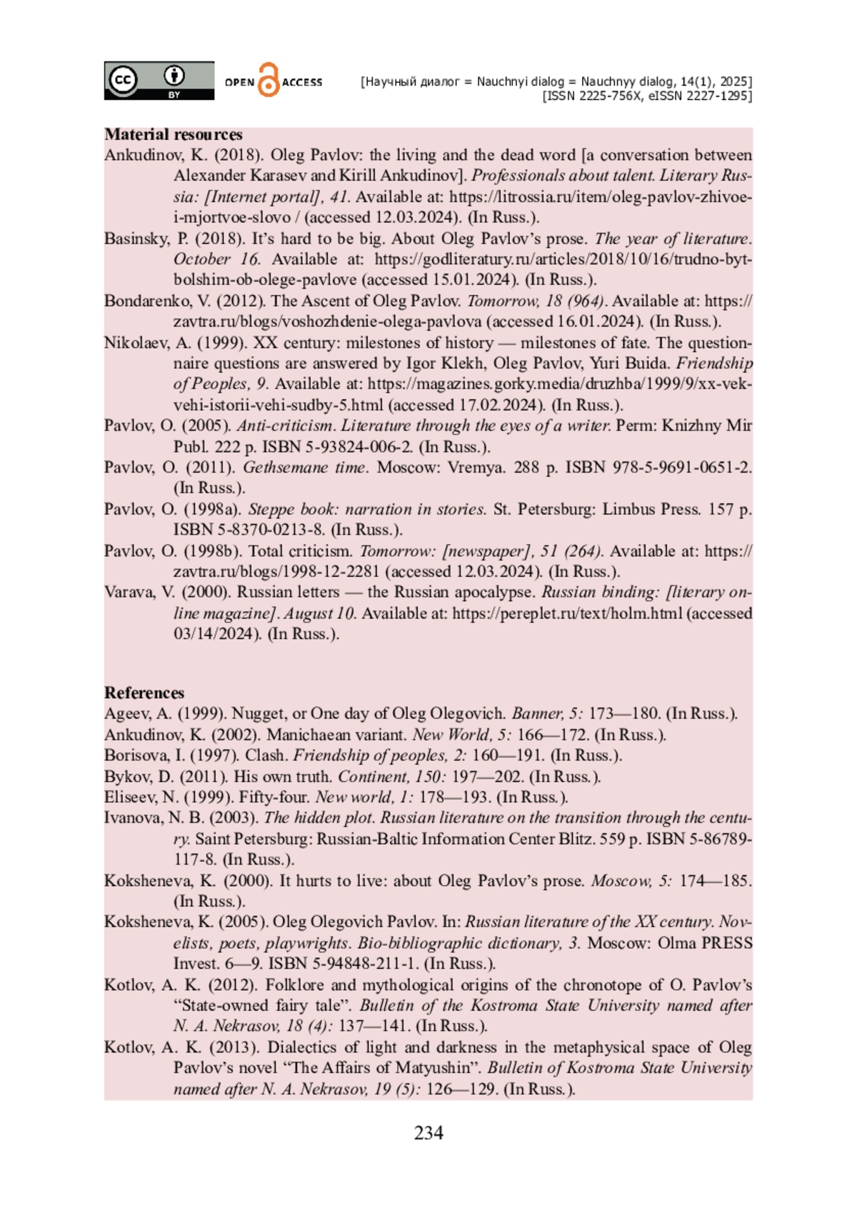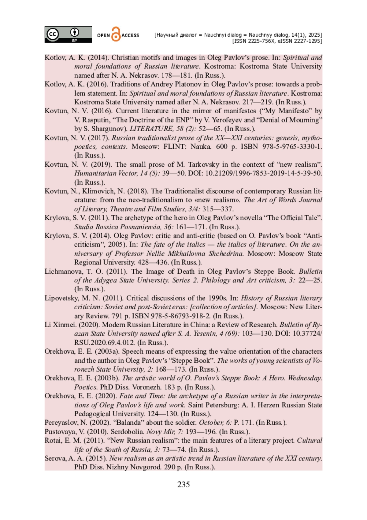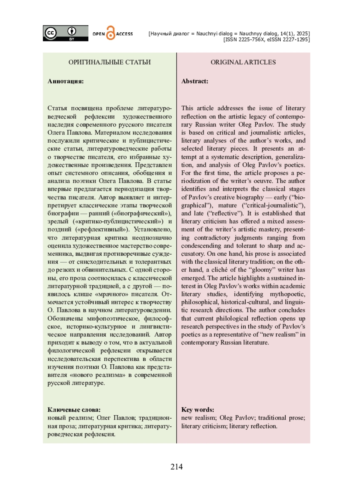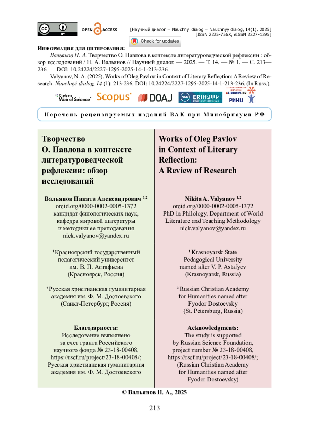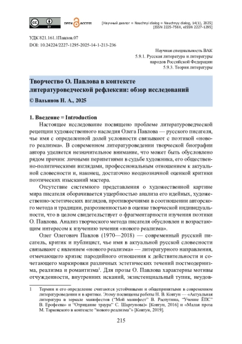 ВАЛЬЯНОВ Н. А. ТВОРЧЕСТВО О. ПАВЛОВА В КОНТЕКСТЕ ЛИТЕРАТУРОВЕДЧЕСКОЙ РЕФЛЕКСИИ: ОБЗОР ИССЛЕДОВАНИЙ // НАУЧНЫЙ ДИАЛОГ. 2025. ТОМ 14, № 1