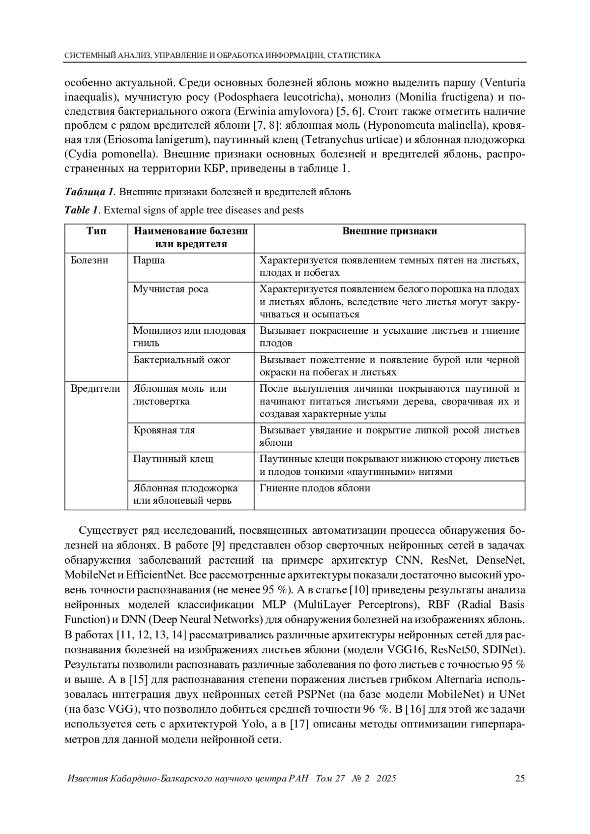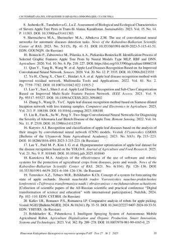 16. Кутырёв А. И. Распознавание и классификация болезней листьев яблони на основе анализа их изображений моделями сверточных нейронных сетей (CNN) // Вестник Ульяновской ГСХА. 2023. № 3(63). С. 215-223. DOI: 10.18286/1816-4501-2023-3-215-223