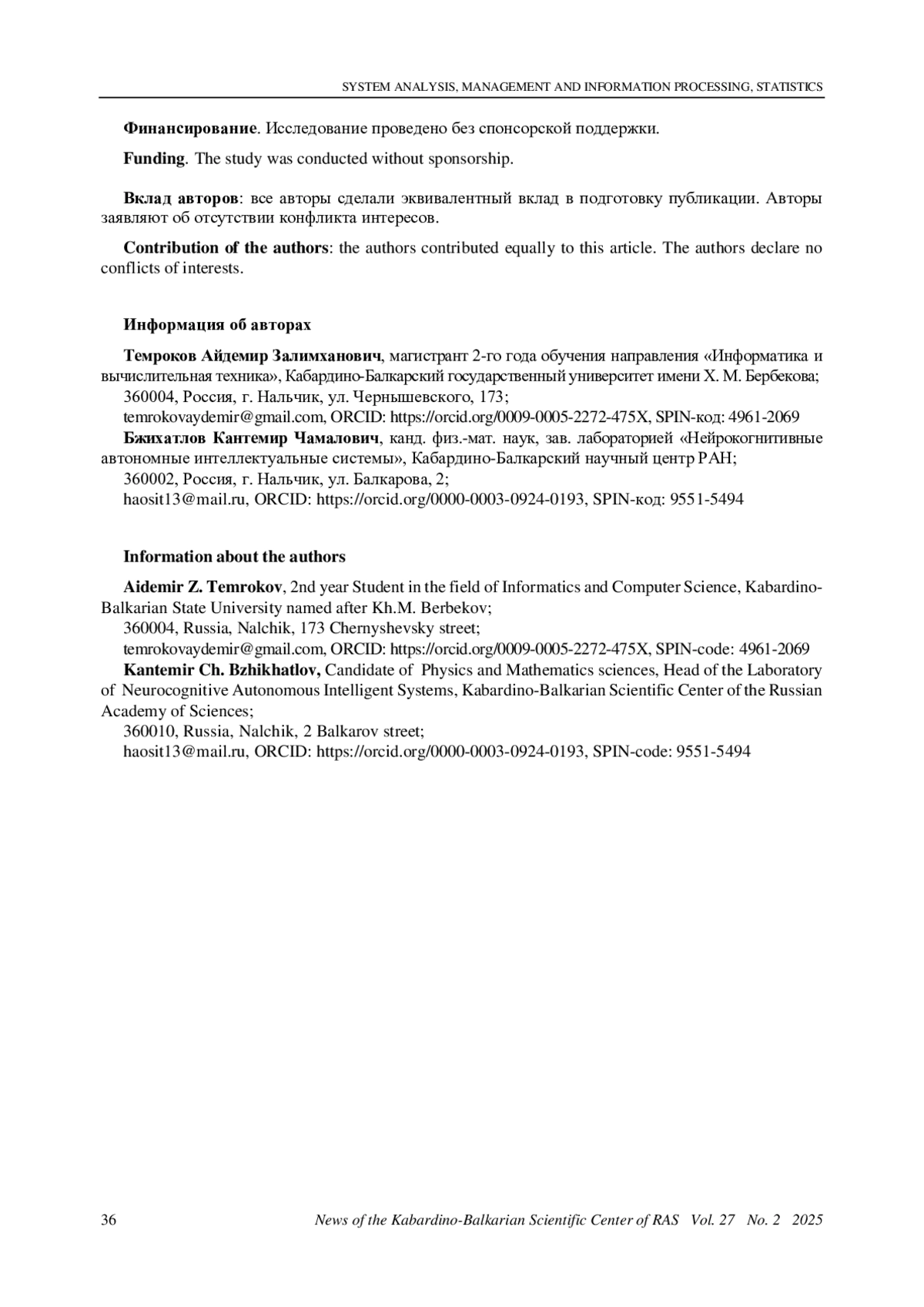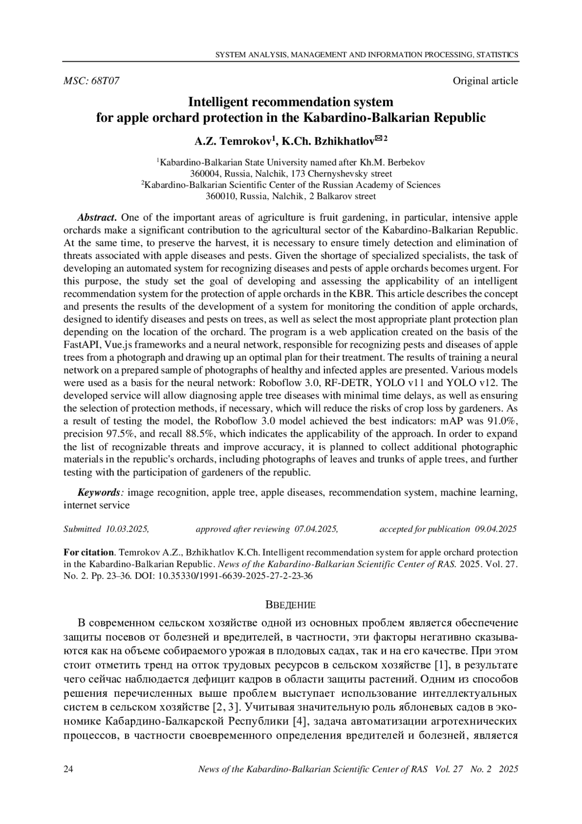 19. Темроков А. З., Тебуев М. Р., Бжихатлов К. Ч. Концепция системы прогнозирования состояния яблоневых садов // Сборник научных трудов Всероссийской научно-практической конференции “Цифровая трансформация науки и образования” с международным участием. Нальчик, 2024. С. 102-110. EDN: CSTJRH
