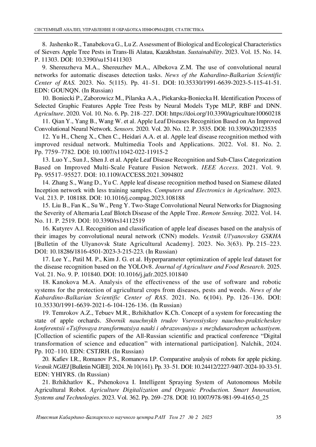 11. Qian Y., Yang B., Wang W. et al. Apple leaf diseases recognition based on an improved convolutional neural network // Sensors. 2020. Vol. 20. No. 12. P. 3535. DOI: 10.3390/s20123535 EDN: MIQXHJ