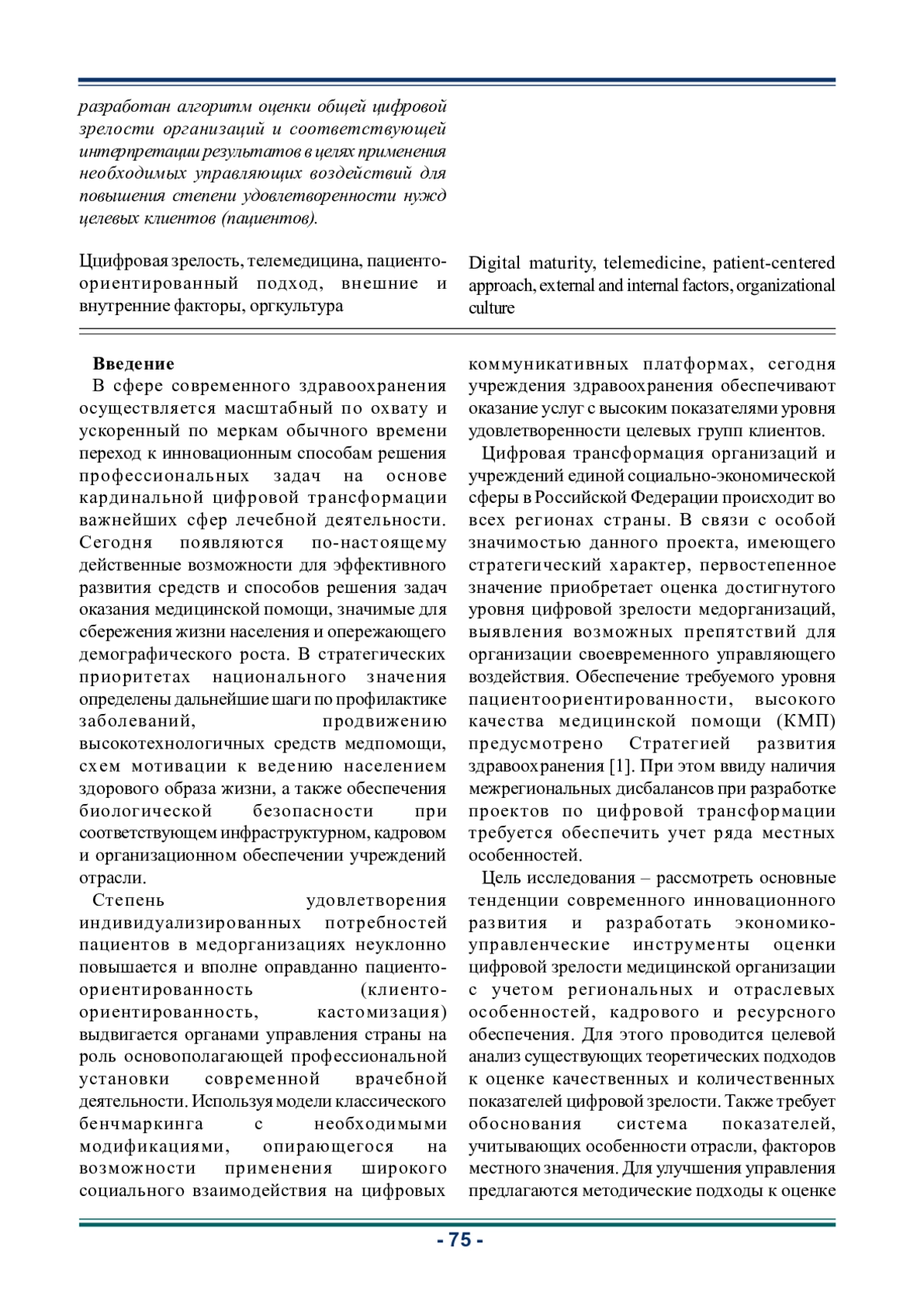 Ключевые фразы: ццифровая зрелость, телемедицина, пациенто- ориентированный подход, внешние и внутренние факторы, оргкультура