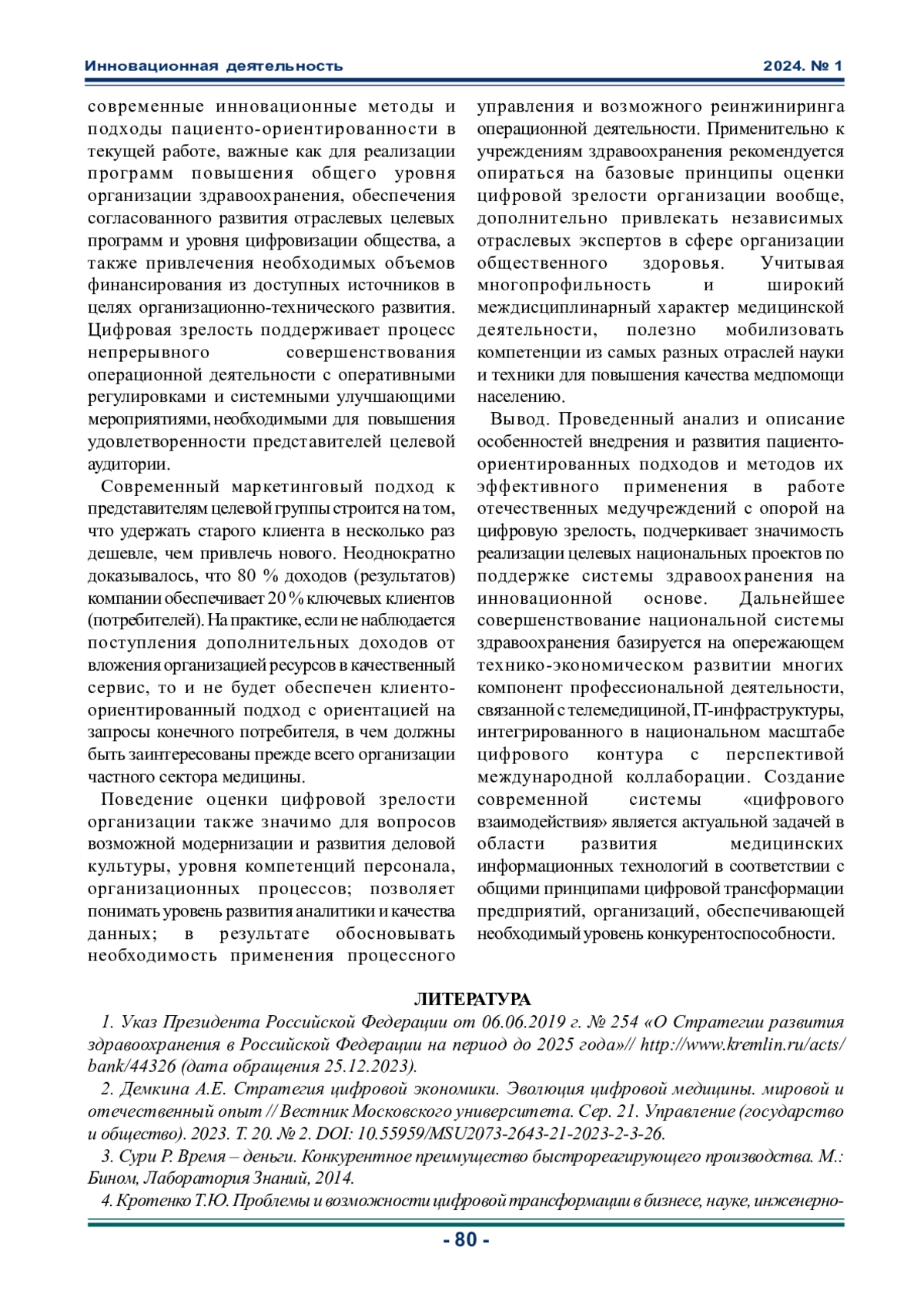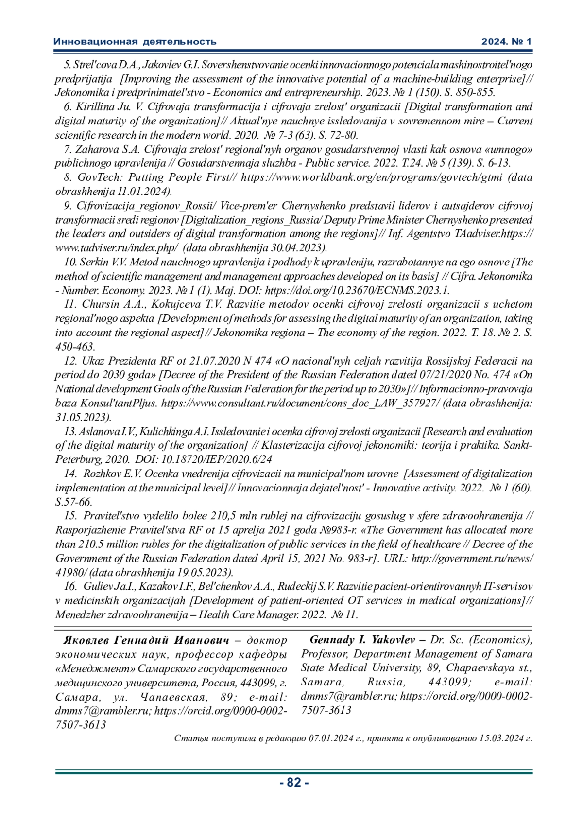 ЯКОВЛЕВ Г. И. ОСОБЕННОСТИ ФОРМИРОВAНИЯ ЦИФРОВОЙ ЗРЕЛОСТИ МЕНЕДЖМЕНТА МЕДИЦИНСКИХ УСЛУГ // ИННОВАЦИОННАЯ ДЕЯТЕЛЬНОСТЬ. 2024. № 1 (68)