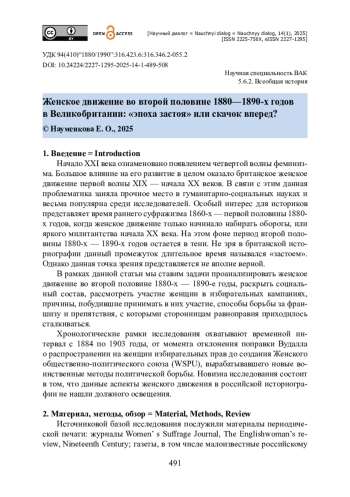 Изучается женское движение в Великобритании во 2 половине 1880—1890-х годов. Источниками выступили материалы периодической печати, публицистика, мемуары и воспоминания современников, стенограммы заседаний британского парламента. Опровергаются крайние в историографии точки зрения, что 1890-е годы были периодом упадка женского движения или, напротив, временем прорыва. Автор приходит к выводу, что в указанный период шло постепенное развитие, сопровождающееся взлетами и неудачами. Сообщается, что, с одной стороны, расширялся социальный состав и совершенствовалась организационная структура движения, увеличивалось количество сторонников в парламенте, росла роль женщин в избирательных кампаниях и местном самоуправлении. Показано, что уже в конце 1880-х годов дамы стали восприниматься как серьезная политическая сила. Отмечается, что, с другой стороны, главная цель — получение избирательных прав — достигнута не была, количество женщин, работавших в выборных структурах и предвыборных кампаниях было невелико относительно основной массы населения, неоднократные расколы движения свидетельствует об определённой слабости в первой половине исследуемого периода. Проанализированы причины, побуждавшие дам участвовать в работе. Поднимается вопрос о способах борьбы за избирательные права, рассматриваются возникавшие перед суфражистками трудности. Подчеркивается, что в этот период суфражистки, разочаровавшись в конституционных методах борьбы за франшизу, стали постепенно склоняться к воинственным методам.