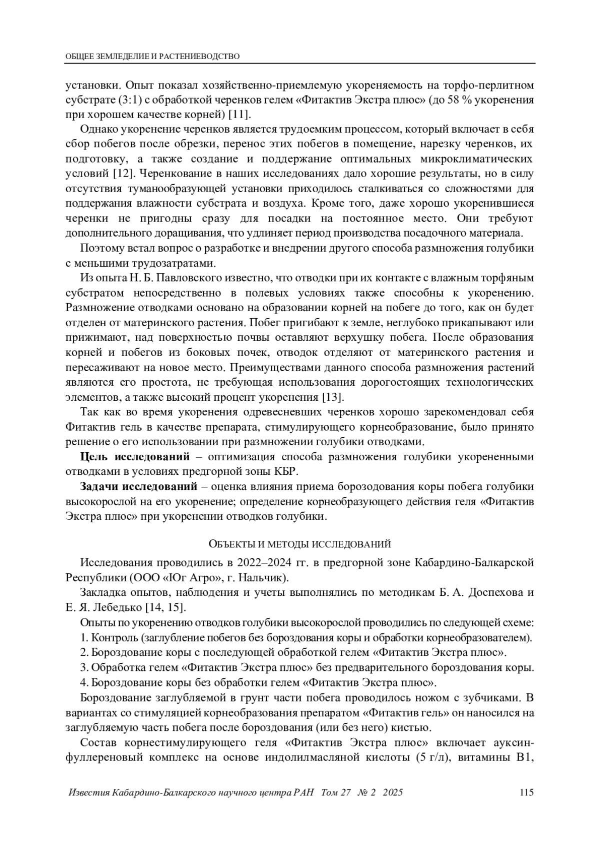 11. Егорова Е. М., Таумурзаева Ф. Д. Укоренение одревесневших черенков голубики высокорослой без применения туманообразующей системы // Известия Кабардино-Балкарского научного центра РАН. 2025. Т. 27. № 1. С. 11-19. DOI: 10.35330/1991-6639-2025-27-1-11-19 EDN: BYIEDX
