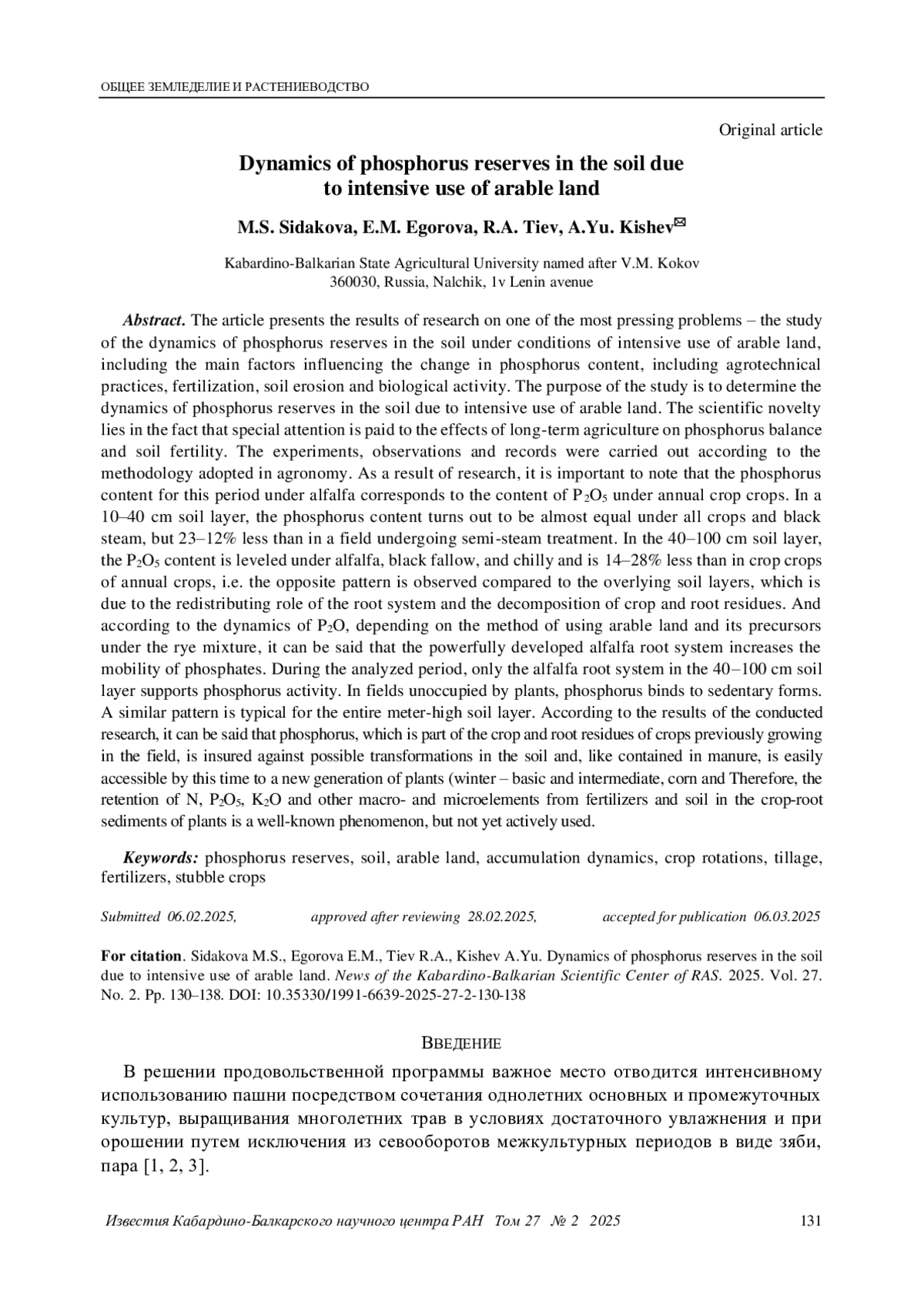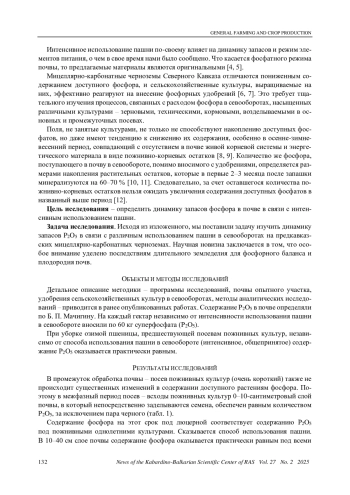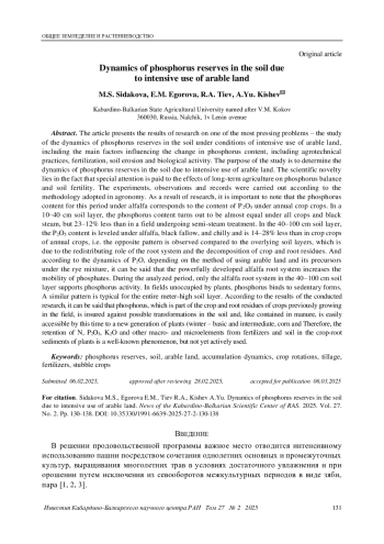 В статье приведены результаты исследований по одной из самых актуальных проблем - динамика запасов фосфора в почве в условиях интенсивного использования пашни, в том числе основные факторы, влияющие на изменение содержания фосфора, включая агротехнические практики, внесение удобрений, эрозию почвы и биологическую активность. Цель исследования - определить динамику запасов фосфора в почве в связи с интенсивным использованием пашни. Научная новизна заключается в том, что особое внимание уделено последствиям длительного земледелия для фосфорного баланса и плодородия почв. Закладка опытов, наблюдения и учеты выполнялись по методике, принятой в агрономии. В результате исследований важно отметить, что содержание фосфора на этот срок под люцерной соответствует содержанию Р2О5 под пожнивными однолетними культурами. В 10-40-сантиметровом слое почвы содержание фосфора оказывается практически равным под всеми культурами и черным паром, но на 23-12 % меньше по сравнению с полем, подвергающимся полупаровой обработке. А в 40-100 см слое почвы выравнивается содержание P2O5 под люцерной, черным паром, зябью и оказывается на 14-28 % меньше по сравнению с пожнивными посевами однолетних культур, т. е. наблюдается обратная картина по сравнению с вышележащими слоями почвы, что обусловливается перераспределяющей ролью корневой системы и разложением пожнивно-корневых остатков. А относительно исследований по динамике Р2О5 в зависимости от способа использования пашни и предшественников под вика-ржаной смесью важно отметить, что мощно развитая корневая система люцерны повышает подвижность фосфатов. В анализируемый период только корневая система люцерны в 40-100 см слое почвы поддерживает активность фосфора. В полях, не занятых растениями, фосфор связывается в малоподвижные формы. Аналогичная картина характерна для всего метрового слоя почвы. По результатам проведенных исследований можно сказать, что фосфор, входящий в состав пожнивно-корневых остатков ранее произрастающих на поле культур, застрахован от возможных превращений в почве и подобно содержащемуся в навозе легко доступен к этому времени новому поколению растений (озимым - основным и промежуточным, кукурузе и т. д.). Поэтому удержание N, Р2О5, К2О и других макро- и микроэлементов из удобрений и почвы в пожнивно-корневых остатках растений представляет, хотя и известное, но по-настоящему активно еще не используемое явление.