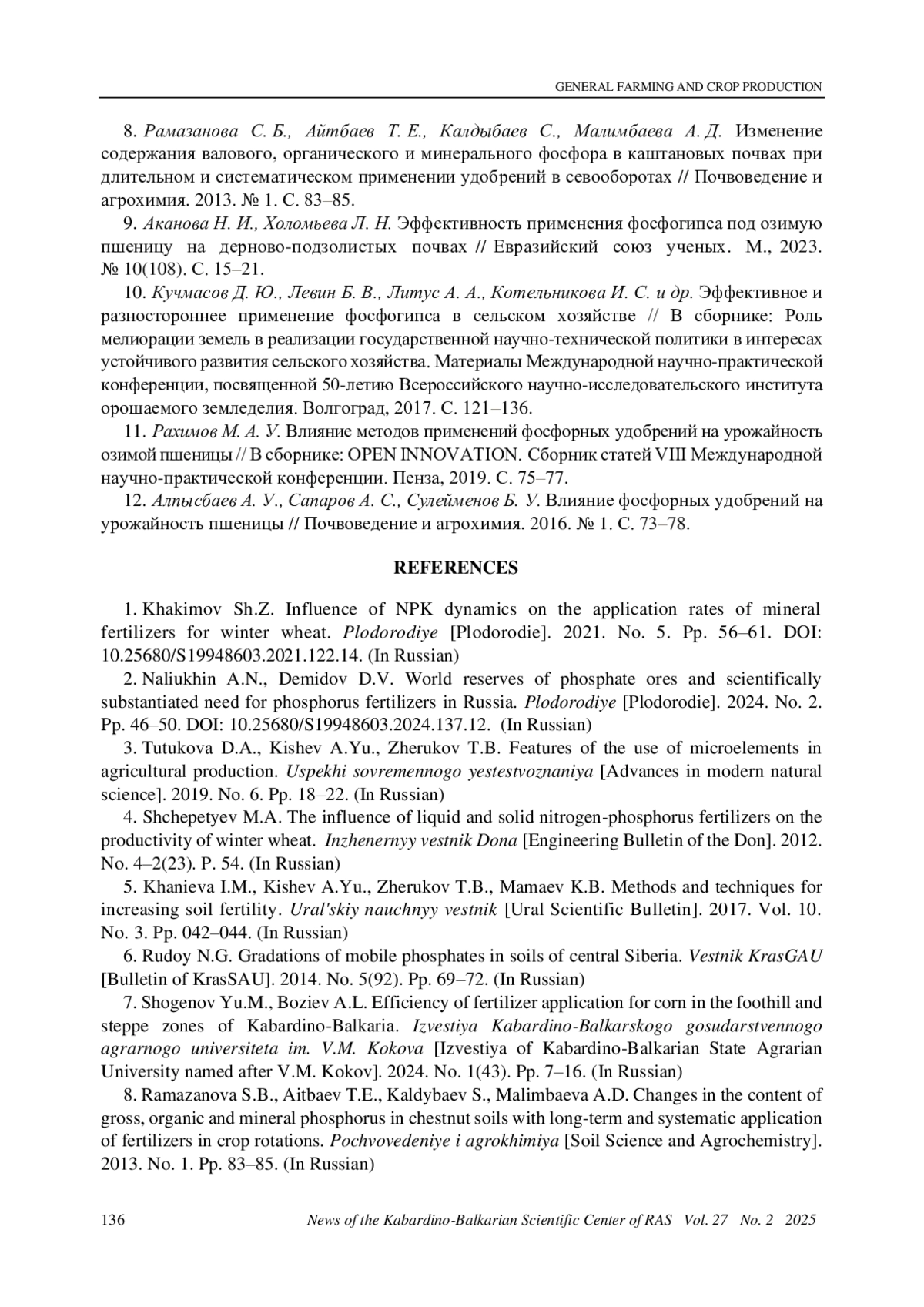 1. Хакимов Ш. З. Влияние динамики NPK на дозы внесения минеральных удобрений под озимую пшеницу // Плодородие. 2021. № 5. С. 56-61. DOI: 10.25680/S19948603.2021.122.14 EDN: HQDXZA