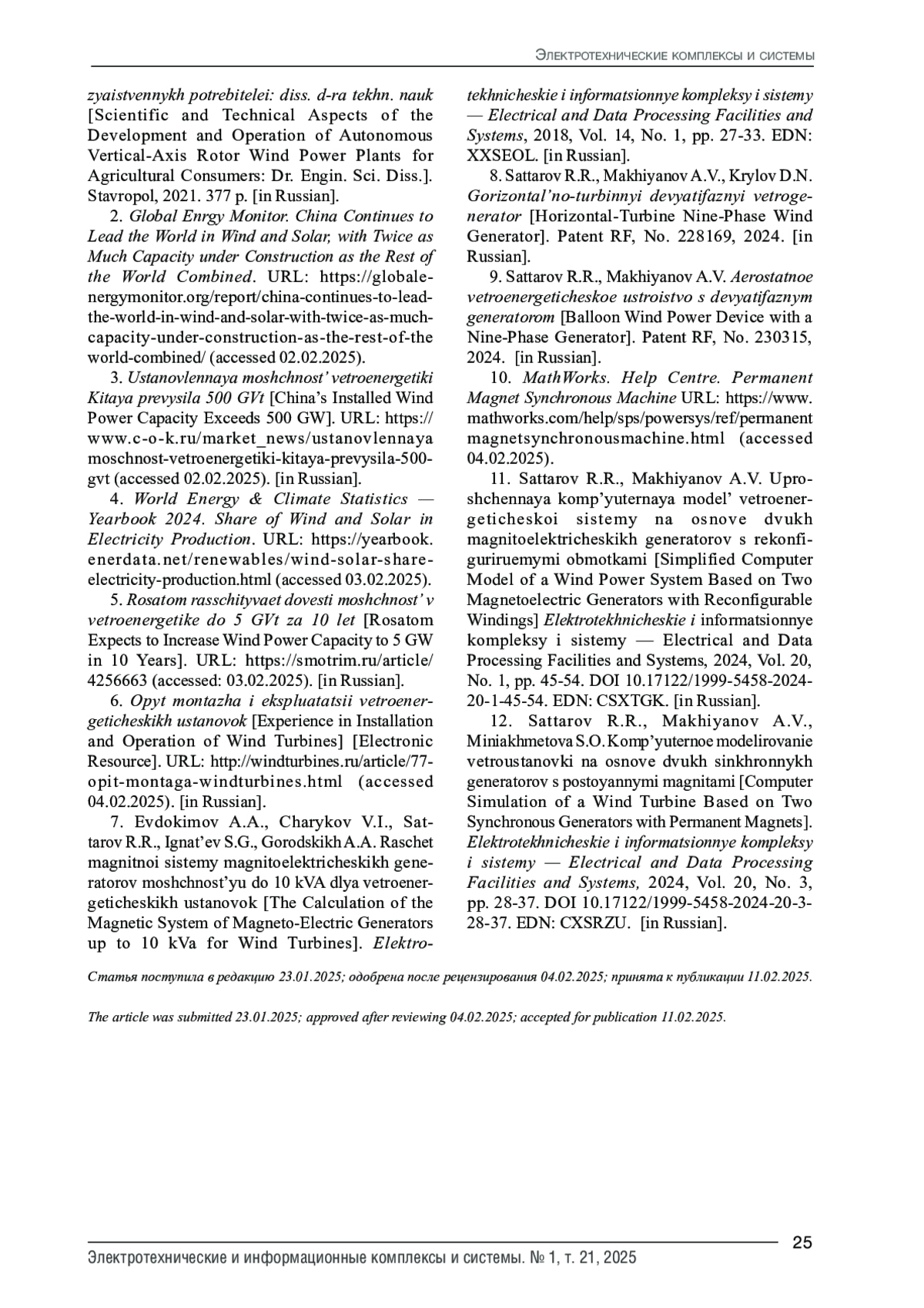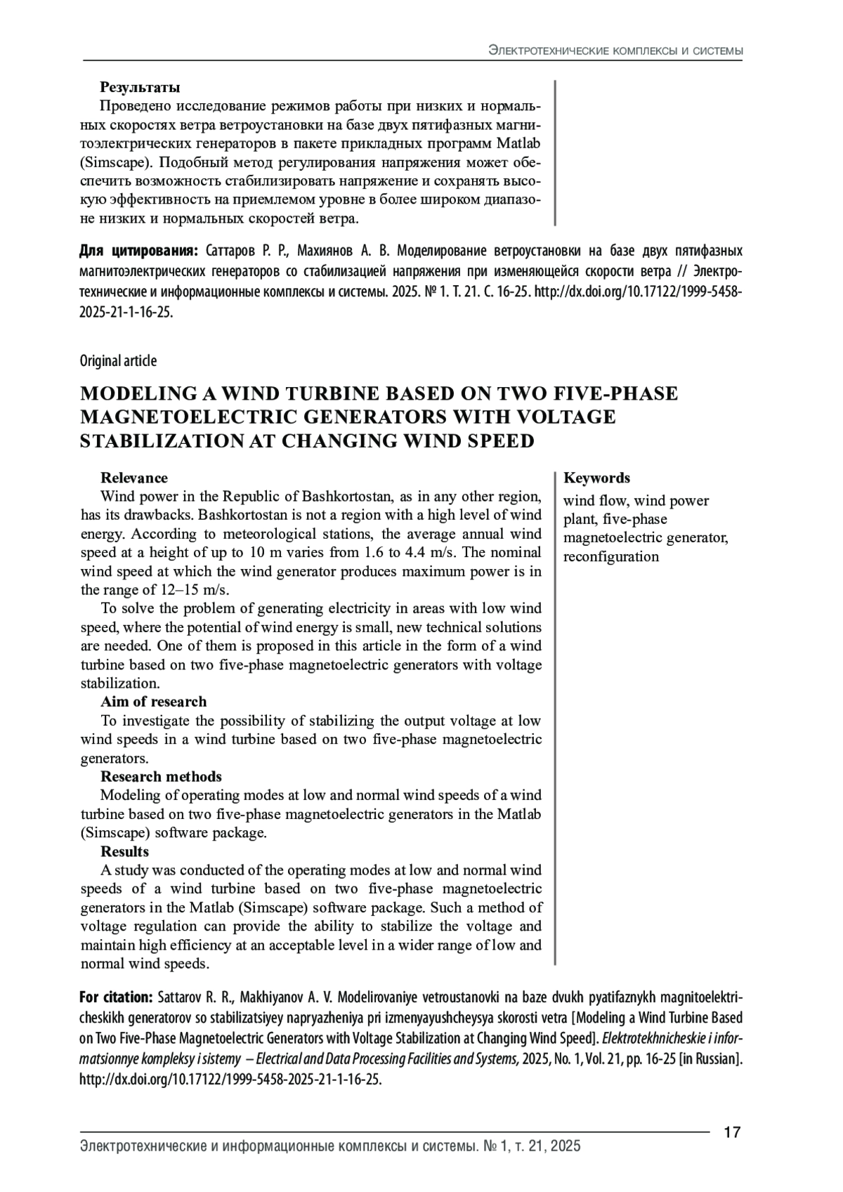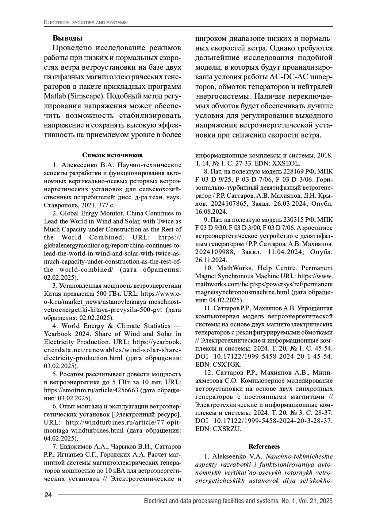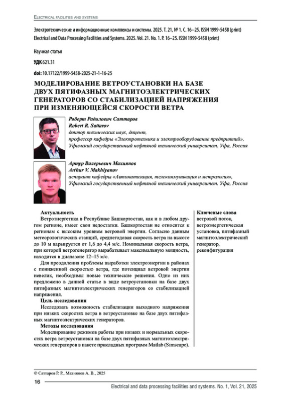 САТТАРОВ Р. Р., МАХИЯНОВ А. В. МОДЕЛИРОВАНИЕ ВЕТРОУСТАНОВКИ НА БАЗЕ ДВУХ ПЯТИФАЗНЫХ МАГНИТОЭЛЕКТРИЧЕСКИХ ГЕНЕРАТОРОВ СО СТАБИЛИЗАЦИЕЙ НАПРЯЖЕНИЯ ПРИ ИЗМЕНЯЮЩЕЙСЯ СКОРОСТИ ВЕТРА // ЭЛЕКТРОТЕХНИЧЕСКИЕ И ИНФОРМАЦИОННЫЕ КОМПЛЕКСЫ И СИСТЕМЫ. 2025. Т. 21 № 1
